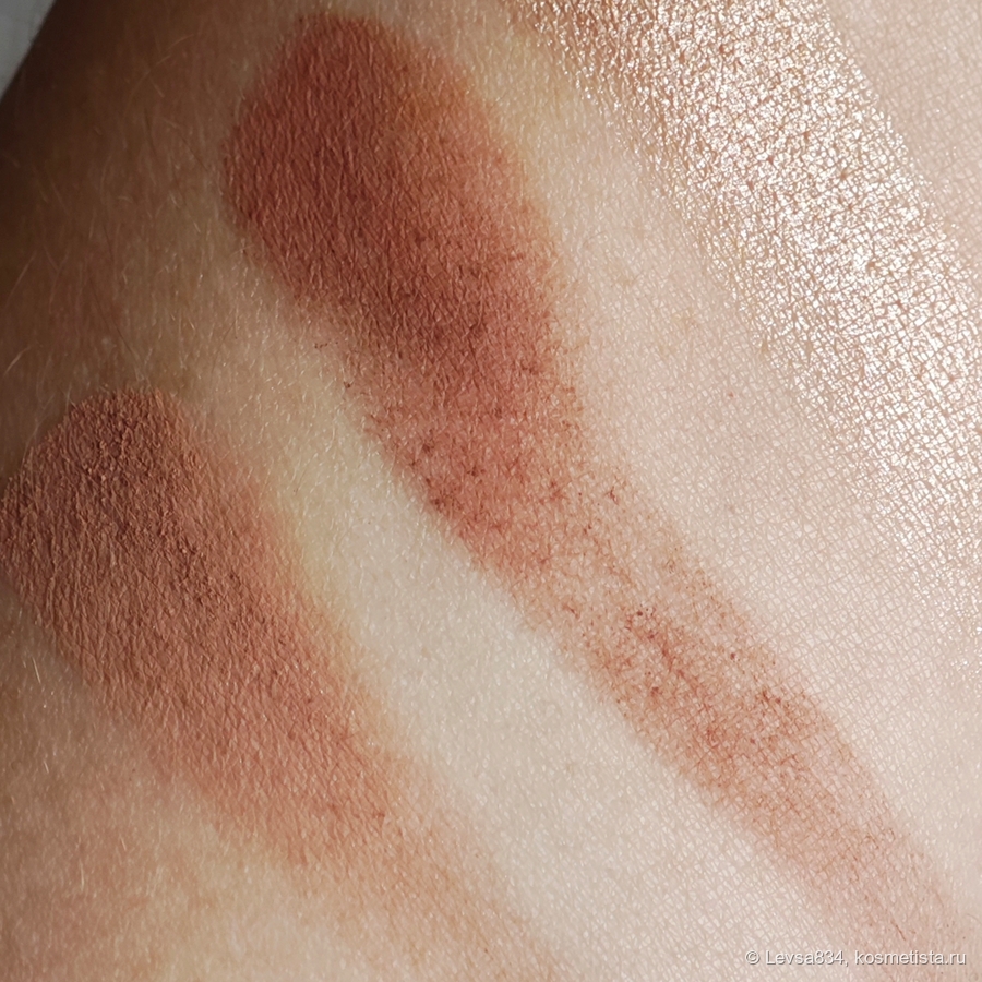 Тёмный пыльно-розовый. Немного грязный розовый, mauve. Он прост в работе, но ему нужна пудровая база, на влажном веке он может поставить пятно. В остальном отличный. Им хорошо получается затемнять внешний уголок глаза, получается без драмы и без перебора, а в самый раз. Использую его и как румяна, вот только кисть выбираю мягкую и наношу на щёки очень легкими движениями. Зато макияж получается гармоничный, и не нужно искать отдельно румяна в цвет. Не пылит, стойкий.