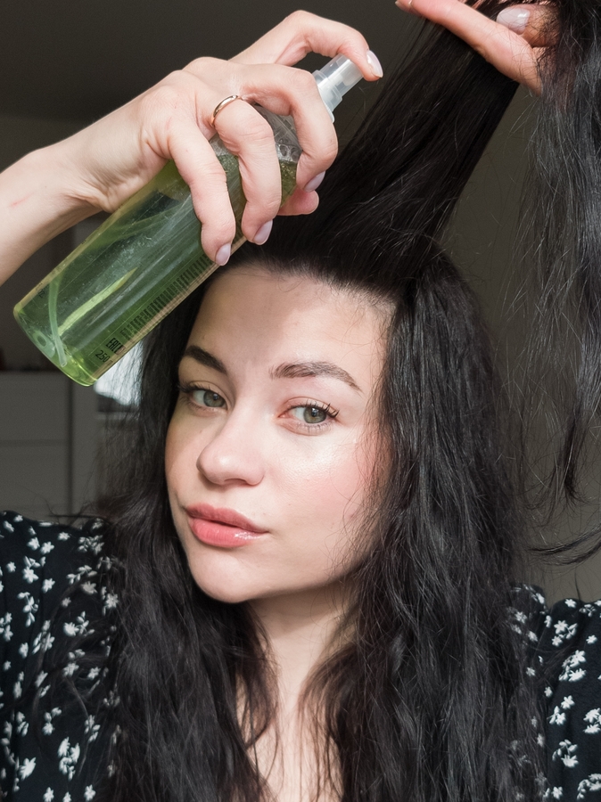 Мне больше нравится спрей, он хоть и не дает такого жесткого каркаса, как пенка, но с ним труднее переборщить и волосы с ним выглядит живее. Довольно щедро брызгаю его на каждый пробор и захватываю немного длины, примерно, до уха.