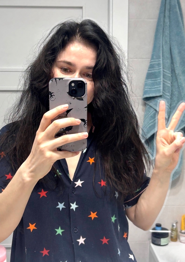 Но давайте сначала про мои волосы. Длинные, пористые, пушистые, немного вьются, не густые и окрашенные в родной цвет. Крашу каждые две-три недели корни — седина с 25 лет не дает расслабиться.