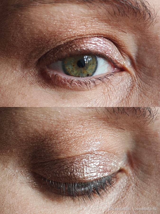 Глаза крашу нюдовой палеткой, дополняю макияж спарклом из розовой, наношу его пальцем на середину подвижного века.
