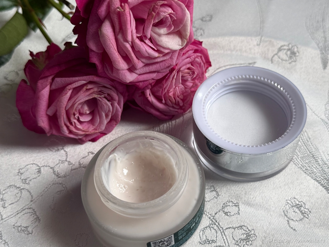Баночка с удобной крышкой, выполнена качественно. Сам крем был защищён пластиковой мембраной. Текстура не жидкая и не плотная, а нечто среднее — идеальная. Она приятна на ощупь и легко распределяется по лицу.