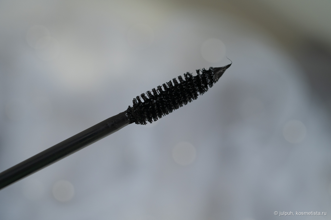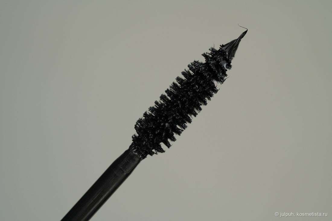 Набирает оптимальное количество туши, а на кончике всегда остается много продукта, показываю на фото. Форма щеточки хорошая, мне лишь не хватило чуть более тонкого кончика, чтобы прокрашивать реснички во внутреннем уголке.