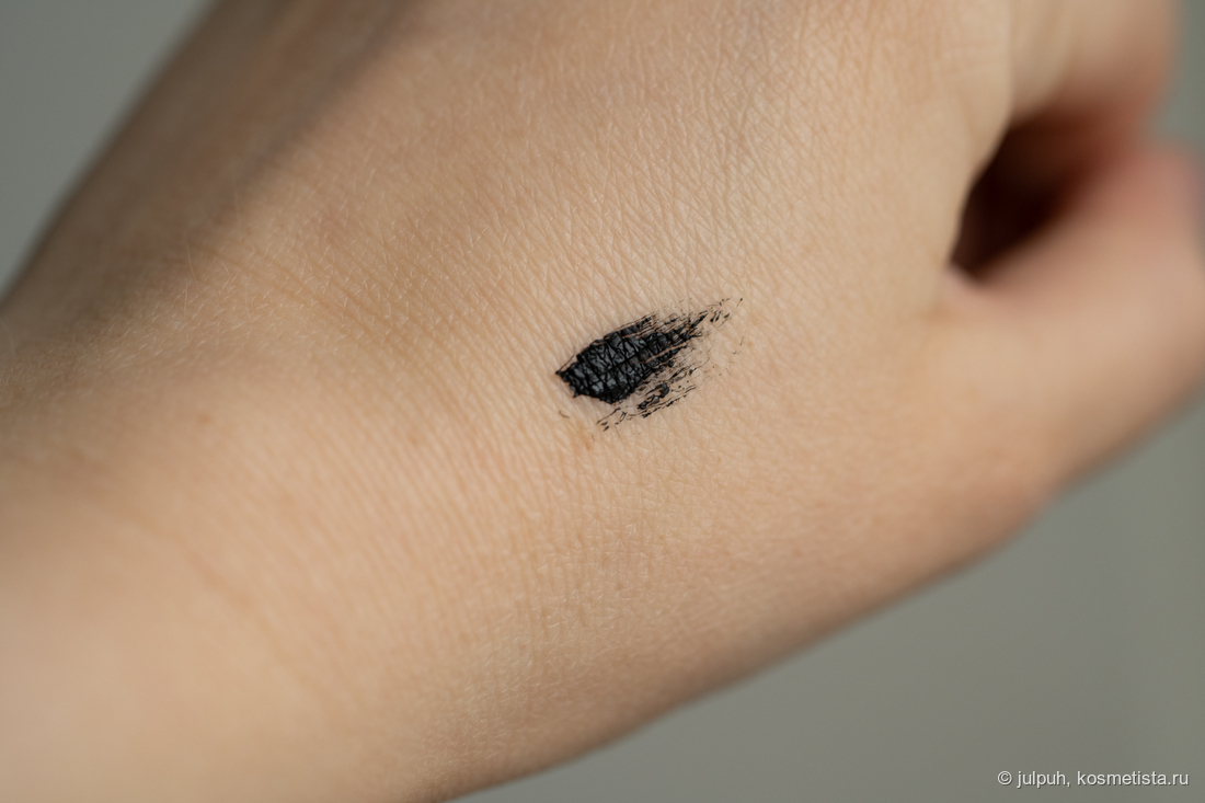 Благодаря щеточке тушь хорошо разделяет реснички. Объема можно добиться при многократном прокрашивании ресниц у корней. Тушь не склеивает, не создает комочки, позволяет довольно долго формировать форму ресниц, не застывает мнгновенно.