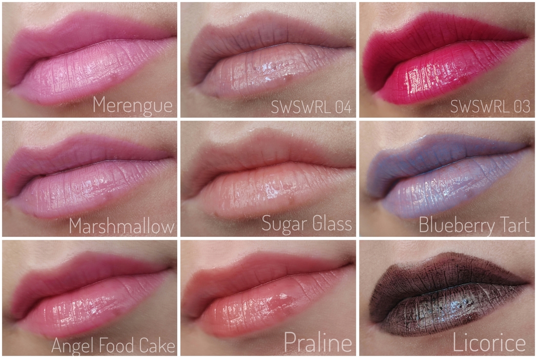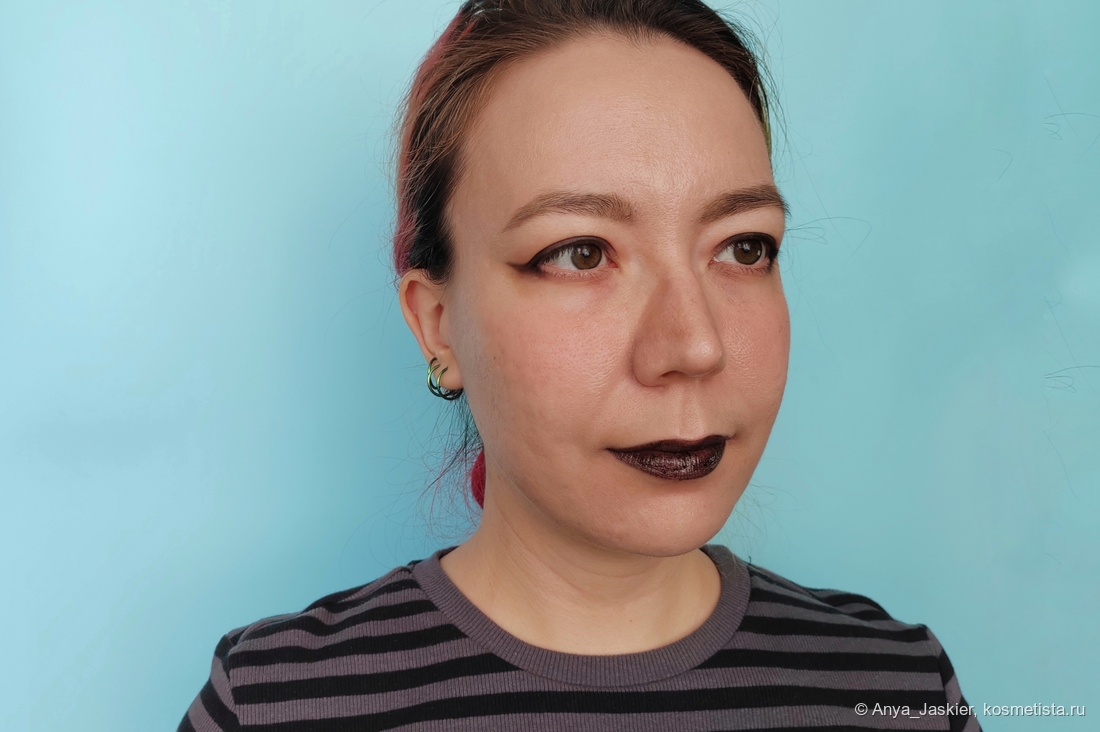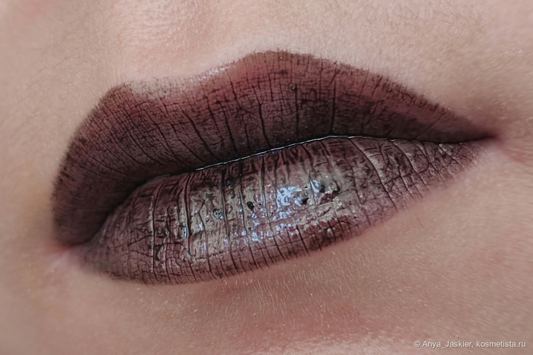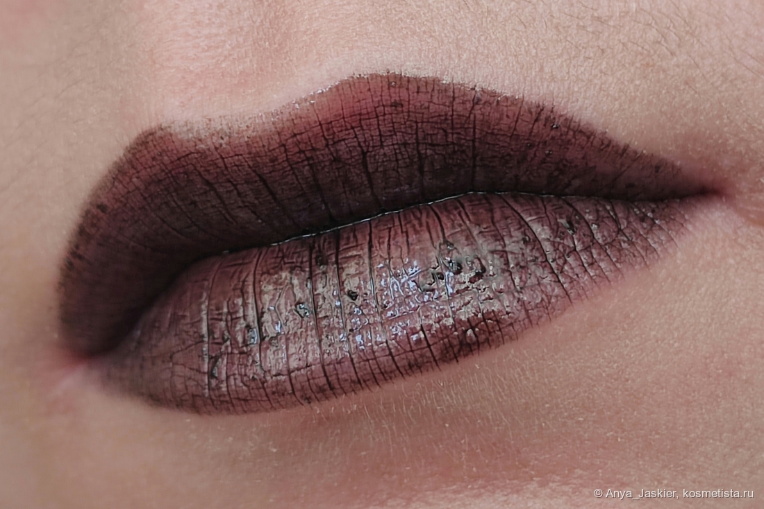 Ложка дегтя в этой бочке меда. Черный цвет в полупрозрачной текстуре — кошмар юного (да и взрослого) неформала. Он подчеркивает вообще все что можно подчеркнуть, а на свет с ним лучше вообще не выходить, скрываясь в полумраке. Вот в полумраке он, чертяка, хорош. Словно лаковая помада. Но капризный при нанесении — стоит чуть переборщить, и он не только все складочки и шелушения выделит, но и соберется в лужицы пигмента, которые будут перемещаться при каждом смыкании губ. А нанесешь меньше чем нужно — будет очень сильно плешивить. Все-таки у Rom&nd гораздо лучше с черным вышло. Хотя, в отличие от Blueberry Tart, Лакрица гораздо чаще носима мной на улицу — прилично выглядит она уже с примерно с полуметра. А в качестве топпера на черную матовую помаду вообще незаменима — и спонжик потом оттирать не нужно.