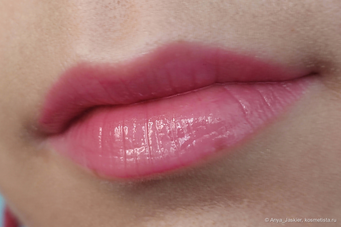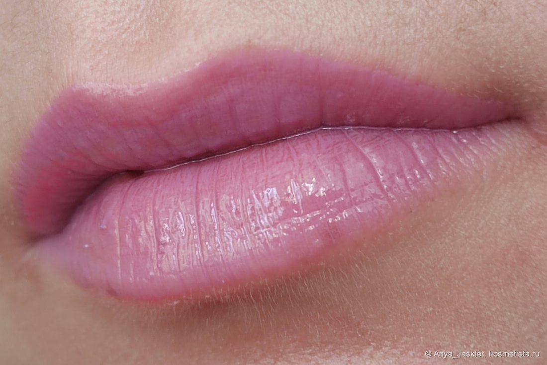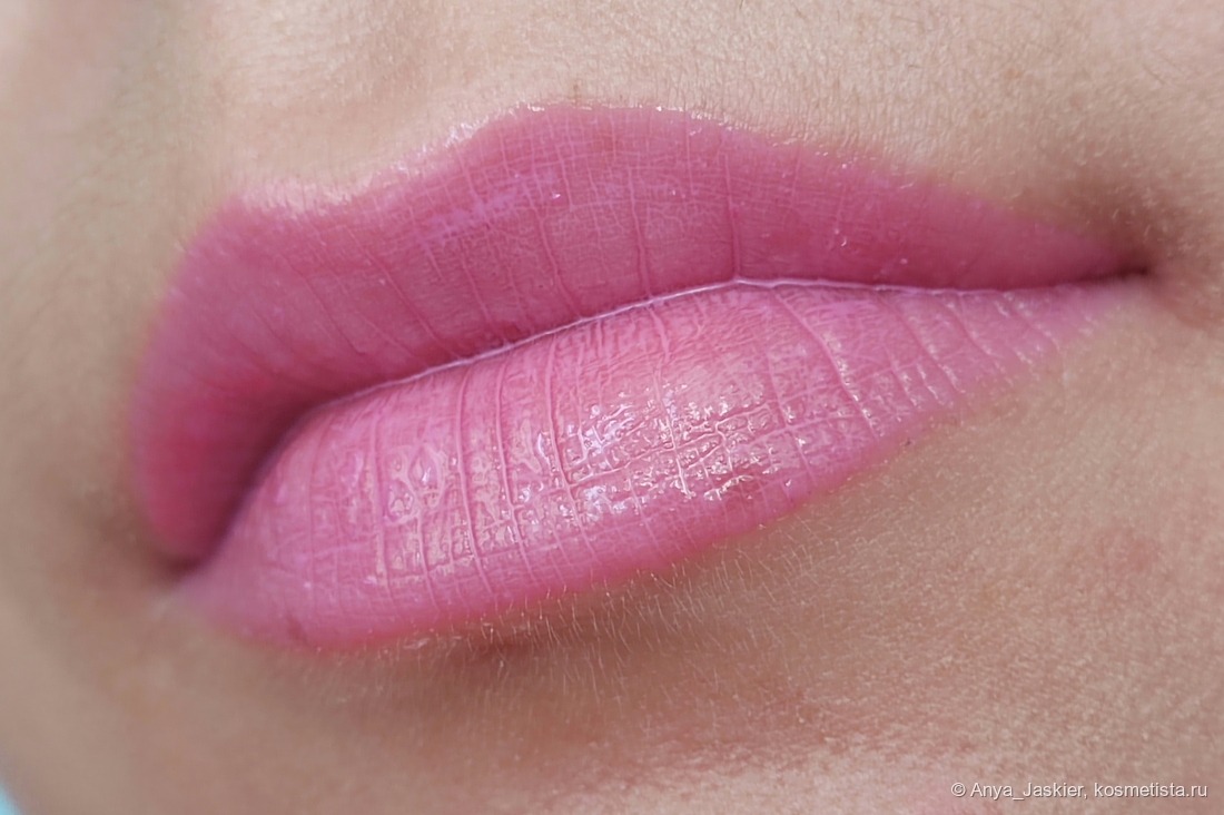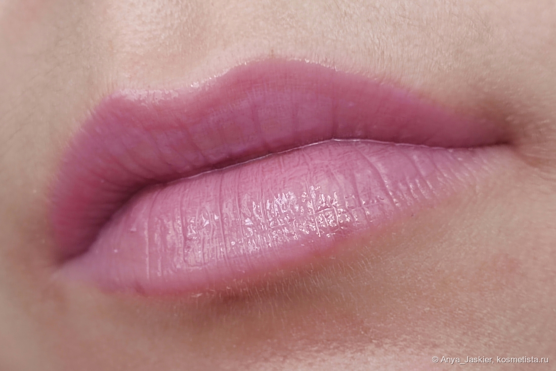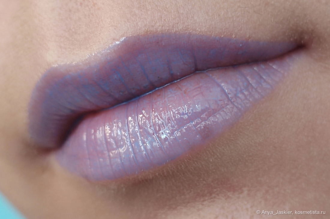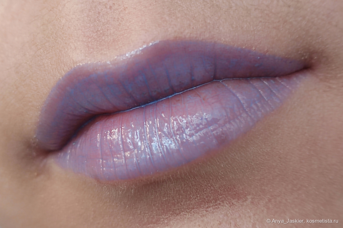 Перехожу к парочке аутсайдеров на фоне остальных. Блеск василькового цвета на моих губах становится лиловым, что немного повышает его носибельность в люди, но лишает шарма. В составе много белого пигмента, который подчеркивает все складки, притворяется белой полоской на стыке и убивает способность к саморазравниванию. На свету он очень сильно плешивит независимо от количества нанесенных слоев, однако на расстоянии метр и дальше выглядит вполне ничего. Несмотря на мою любовь к нестандартным цветам, на выход я его приспособила только в качестве топа на карандаш или матовую помаду, а в обычное время он стоит как настольное пособие в качестве бальзами для губ и примера «как делать не надо».