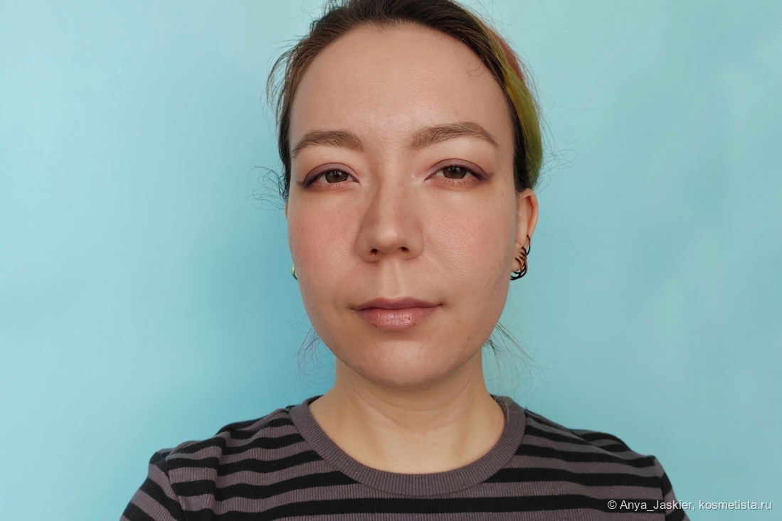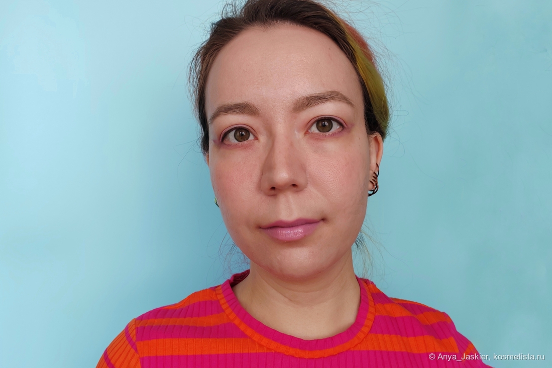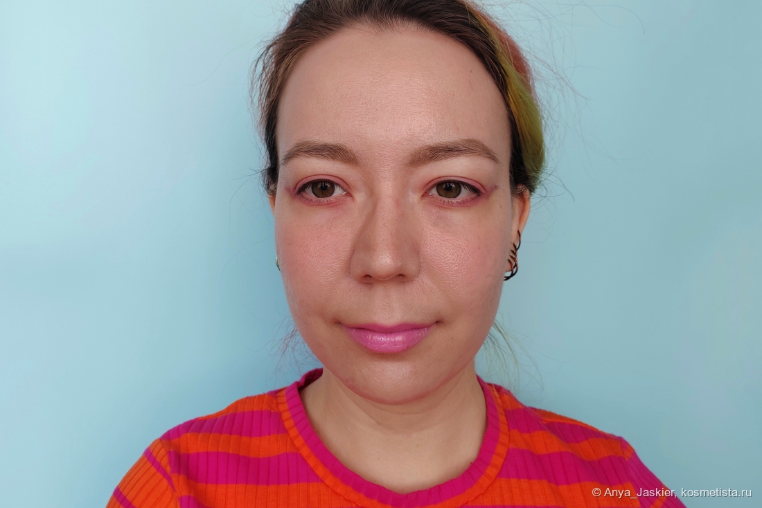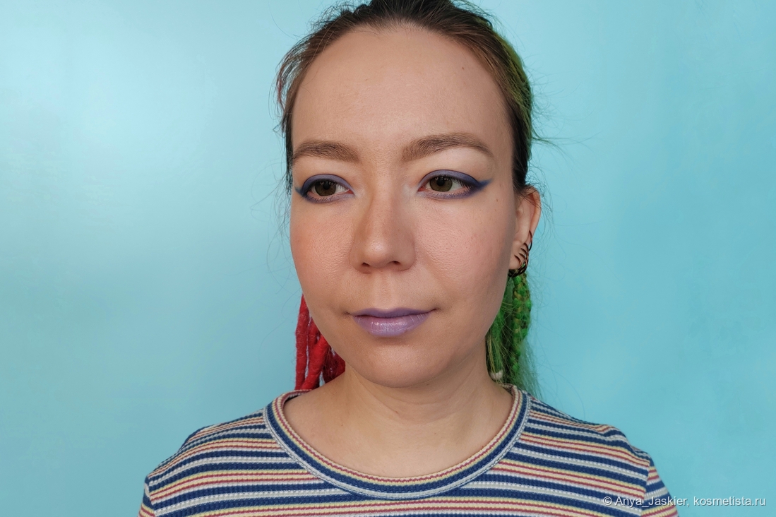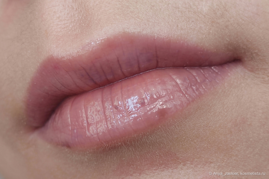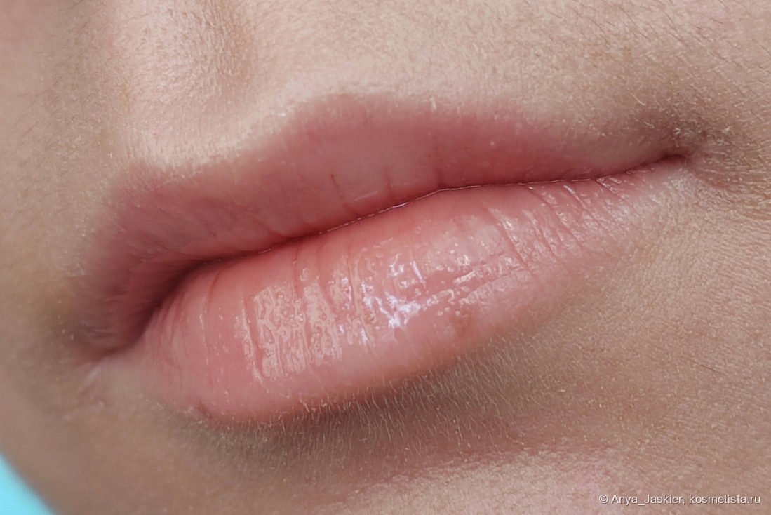 Перехожу к парочке аутсайдеров на фоне остальных. Блеск василькового цвета на моих губах становится лиловым, что немного повышает его носибельность в люди, но лишает шарма. В составе много белого пигмента, который подчеркивает все складки, притворяется белой полоской на стыке и убивает способность к саморазравниванию. На свету он очень сильно плешивит независимо от количества нанесенных слоев, однако на расстоянии метр и дальше выглядит вполне ничего. Несмотря на мою любовь к нестандартным цветам, на выход я его приспособила только в качестве топа на карандаш или матовую помаду, а в обычное время он стоит как настольное пособие в качестве бальзами для губ и примера «как делать не надо».