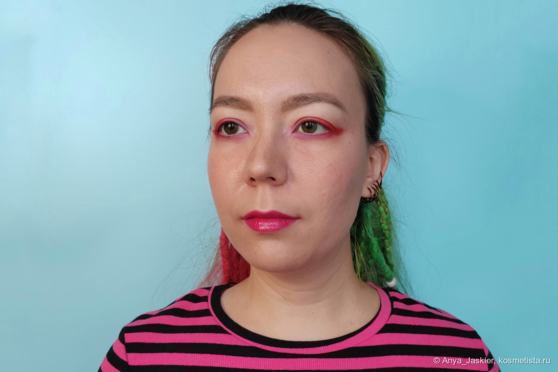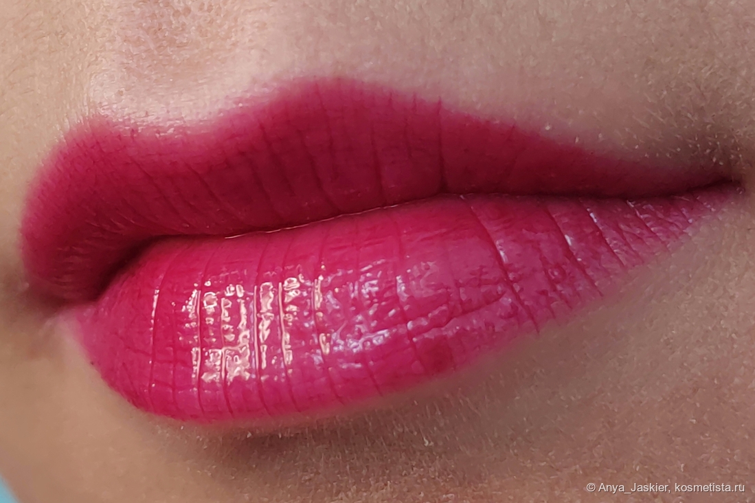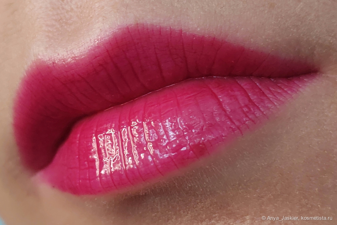 Битлджусовая лимитка, состоящая из красных и сиреневых слоев. На выходе получается холодный малиновый оттенок, прикидывающийся то красным, то барби-розовым. Очень праздничный плотный замес, который выглядит почти как лаковая помада. От блеска остается легкий розовый тинт.