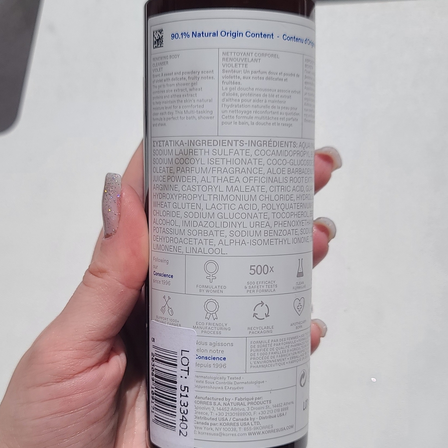 Аромат – главное его украшение. Фиалка здесь звучит очень натурально: не приторно, а именно свежо, цветочно, с лёгкой сладковатой ноткой. Пахнет уютно, аромат остаётся на коже лёгким шлейфом после душа.