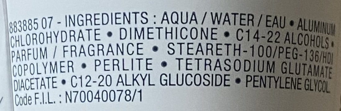Это типичный дезодорант с солями алюминия (Aluminum Chlorohydrate), которые снижают потоотделение, а не просто маскируют запах. Ещё есть Perlite — натуральный минерал вулканического происхождения, который хорошо впитывает влагу и помогает дольше сохранять ощущение сухости, и увлажняющие ингредиенты. И в составе нет спирта, поэтому он не сушит и не раздражает кожу и подходит для чувствительной кожи.