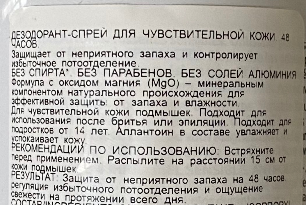 Этот дезодорант обещает защиту от неприятного запаха и избыточного потоотделения до 48 часов. Он без солей аллюминия и подходит для чувствительной кожи, можно использовать после бритья и депиляции. Подходит и для подростков с 14 лет.