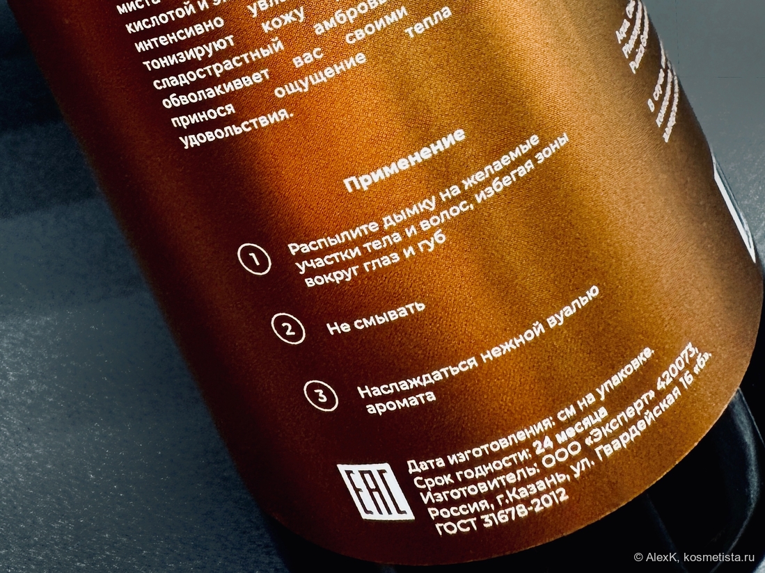 Инструкция: распылить на кожу, волосы или текстиль, избегая глаз и губ.