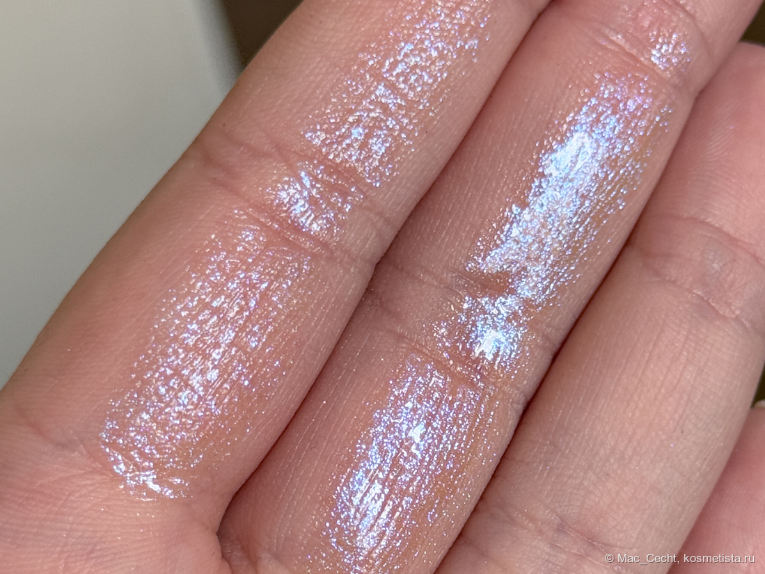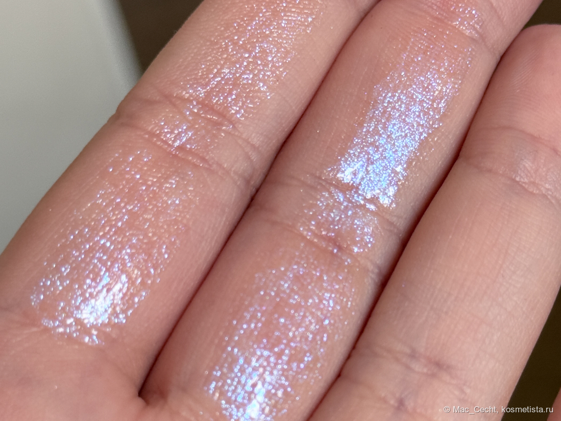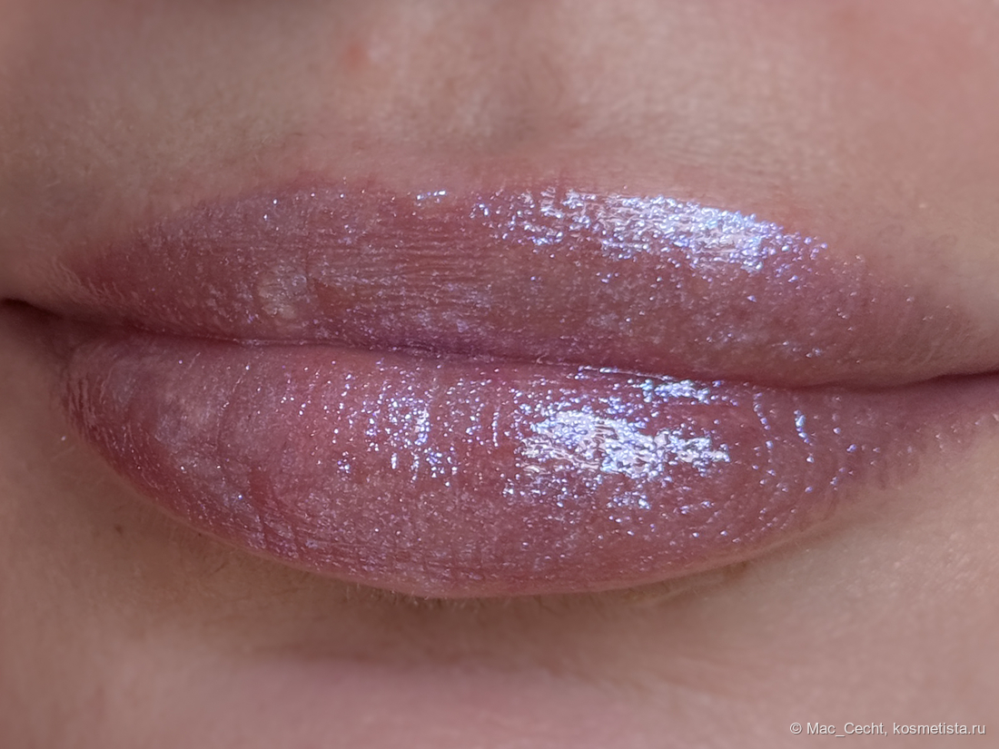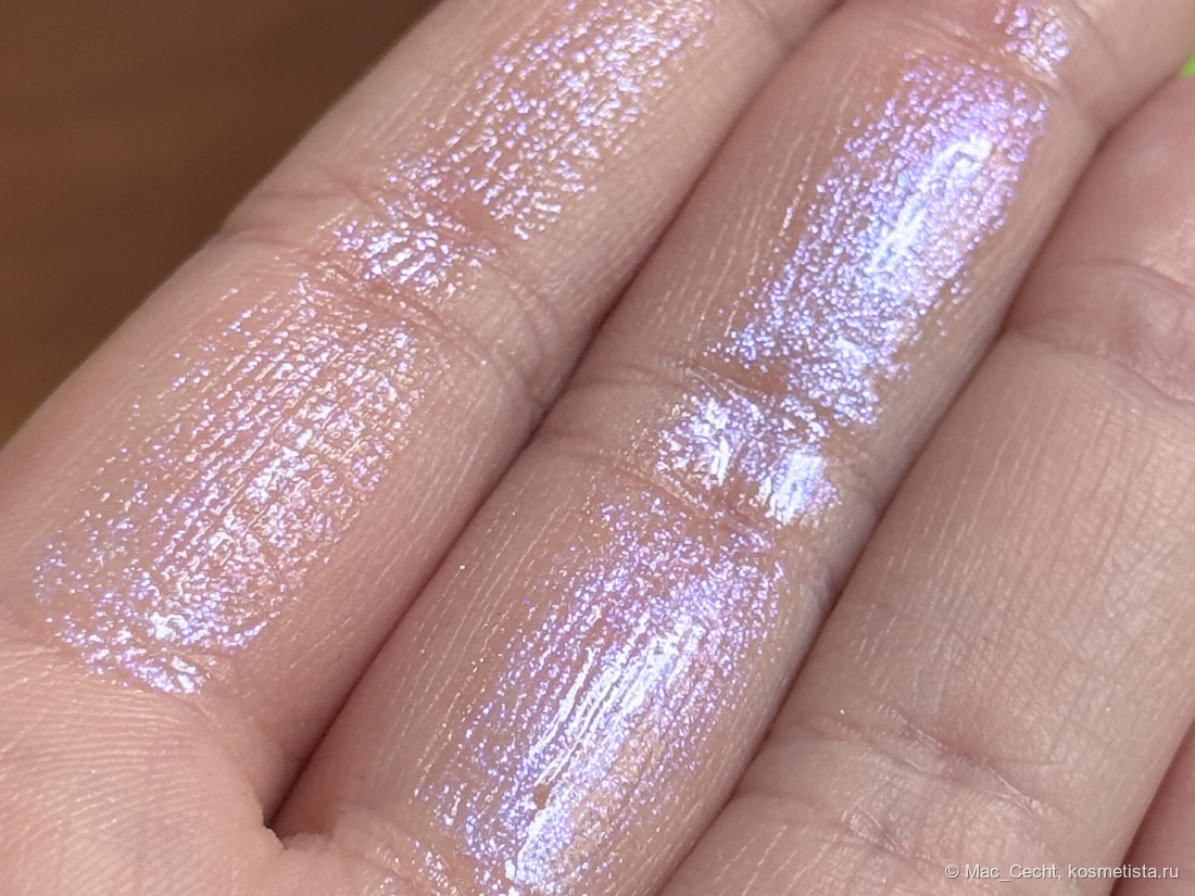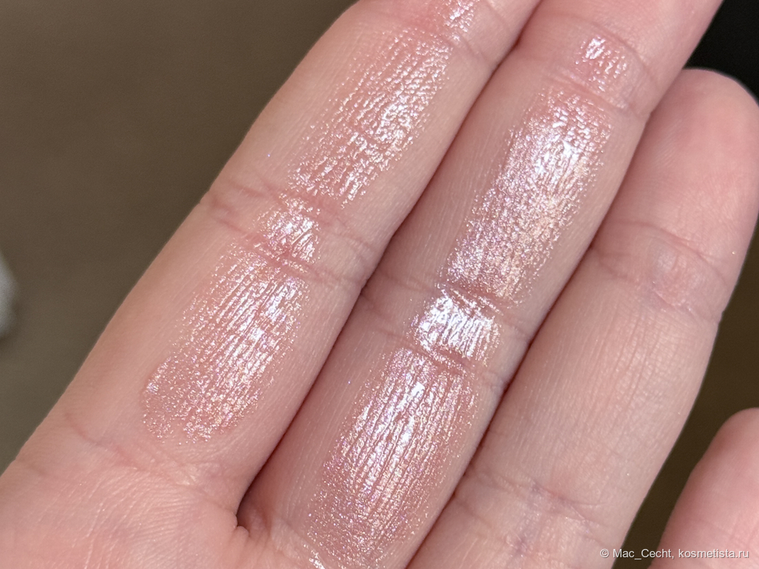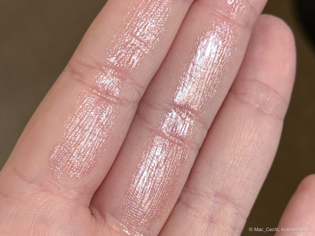 На официальном свотче на губах это был прохладный розово-сиреневый с розово-серебристыми шиммером, а на деле это теплый беж с серебристым шиммером.