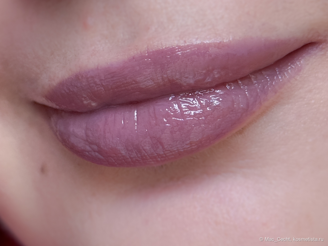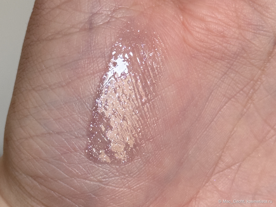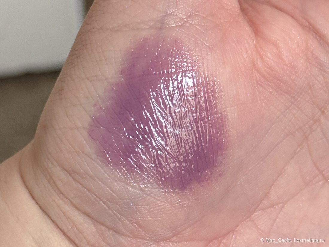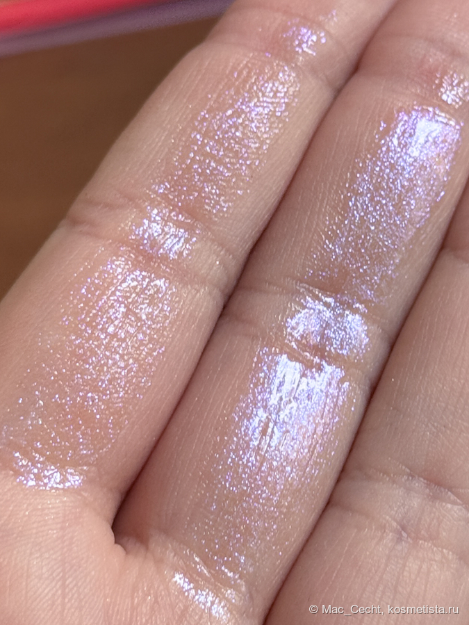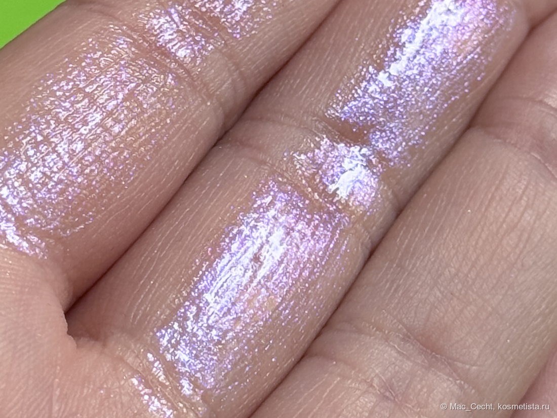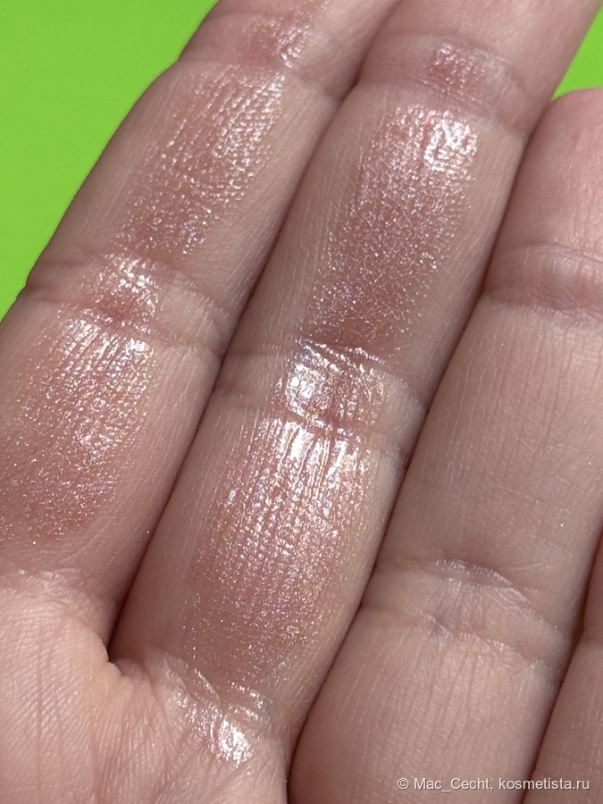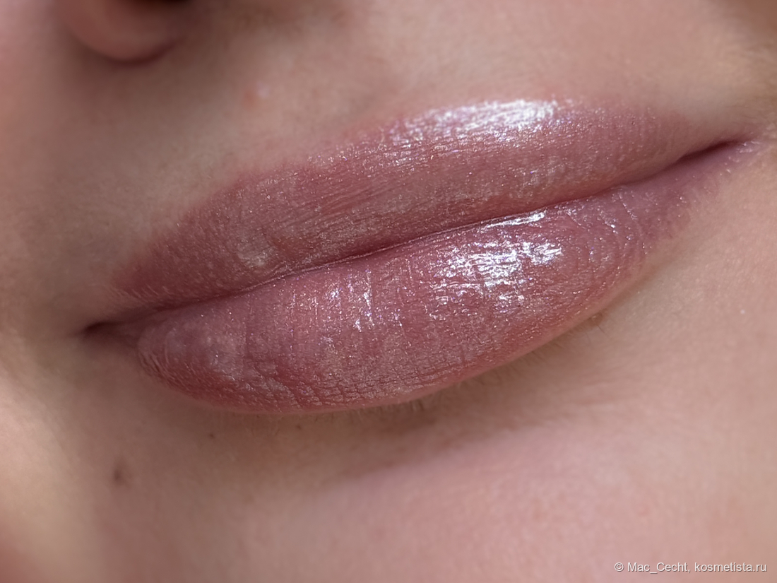 На официальном свотче на губах это был прохладный розово-сиреневый с розово-серебристыми шиммером, а на деле это теплый беж с серебристым шиммером.