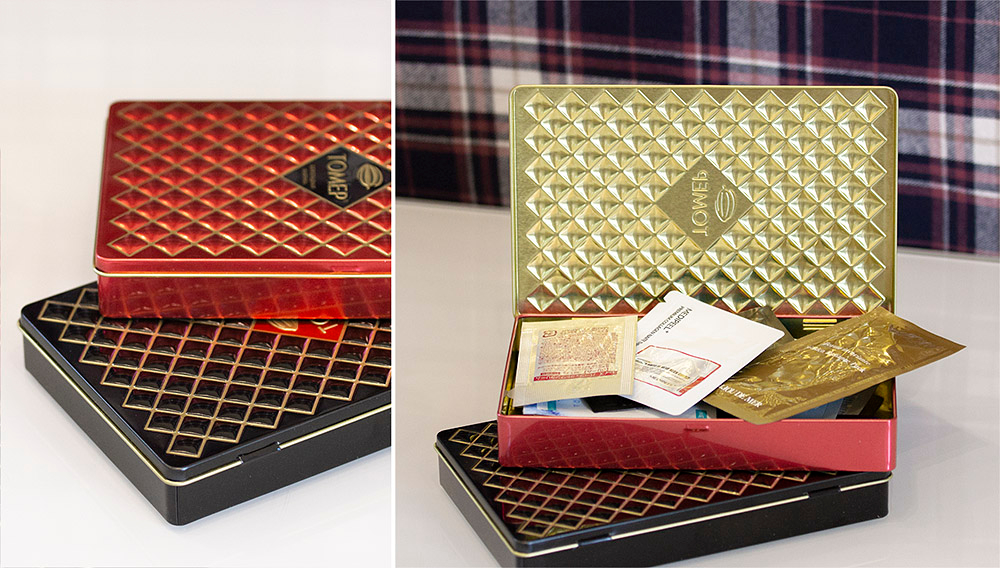 Также на руки и ноги я обычно использую сэмплы косметики из магазинов. Для их хранения прекрасно подошли металлические футляры от шоколада Томер, легко открываются, компактные и красивые.