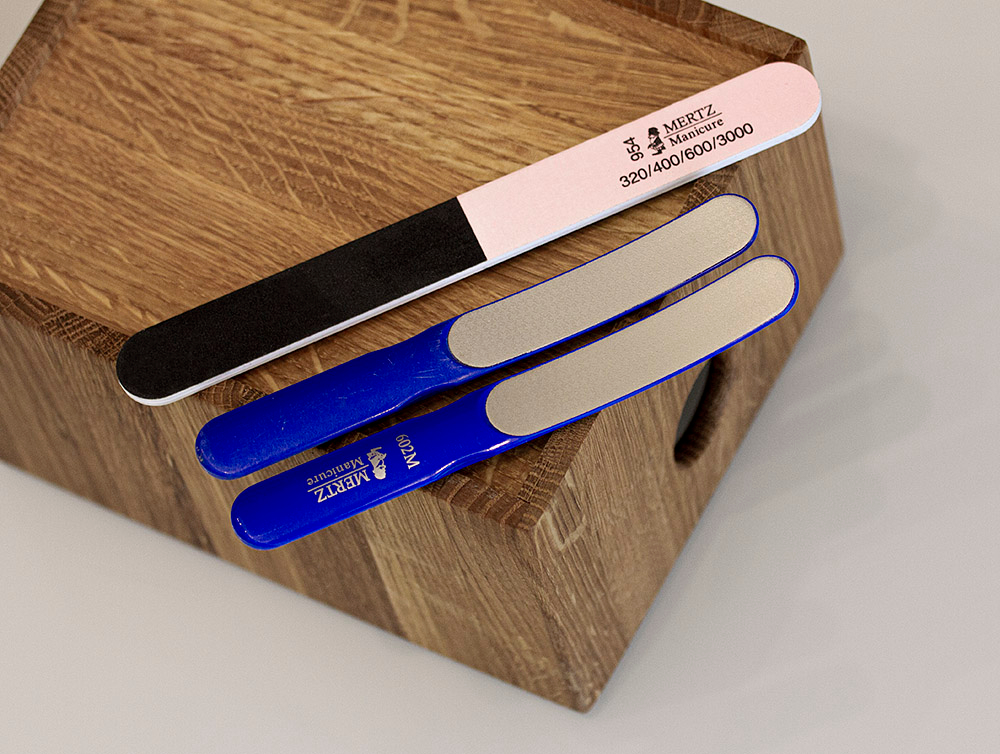 Мелкозернистая Mertz для спиливания сухой кожи валиков и заусенец возле ногтя, лазерная Mertz Solingen 602М — да, я всё еще фанат этой пилки спустя больше 10 лет использования. Недавно моя старушка потерялась дома, пришлось купить новую. Потом и старая нашлась, но переехала в инструменты для педикюра. Напомню: хороша пилака тем, что прекрасно полирует срез ногтя не расслаивая его + у неё удобная немного изогнутая форма.