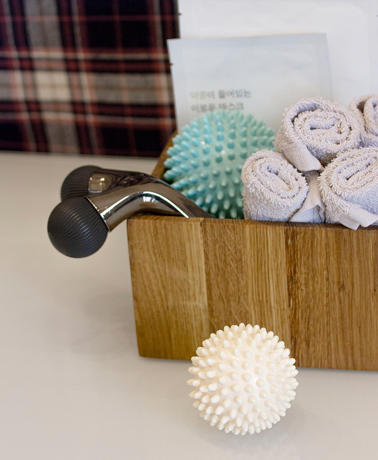 Пока ступни отмокают в эфирных маслах — можно пройтись массажером по ногам, у меня MTG MDNA Onyx Black, он достаточно кусачий. Пока на руках какая-нибудь маска, можно покатать резиновые мячики и размять ступни. Простите, я адепт эффективного расходования времени. Но можно просто полежать без единой мысли в голове :)