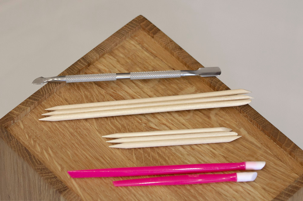 Апельсиновые палочки — самые ходовые. Беру с острым срезом, затачиваю о крупнозернистую пилку. Длинные для маникюра, короткие для педикюра. Не знаю почему, просто так мне удобнее.