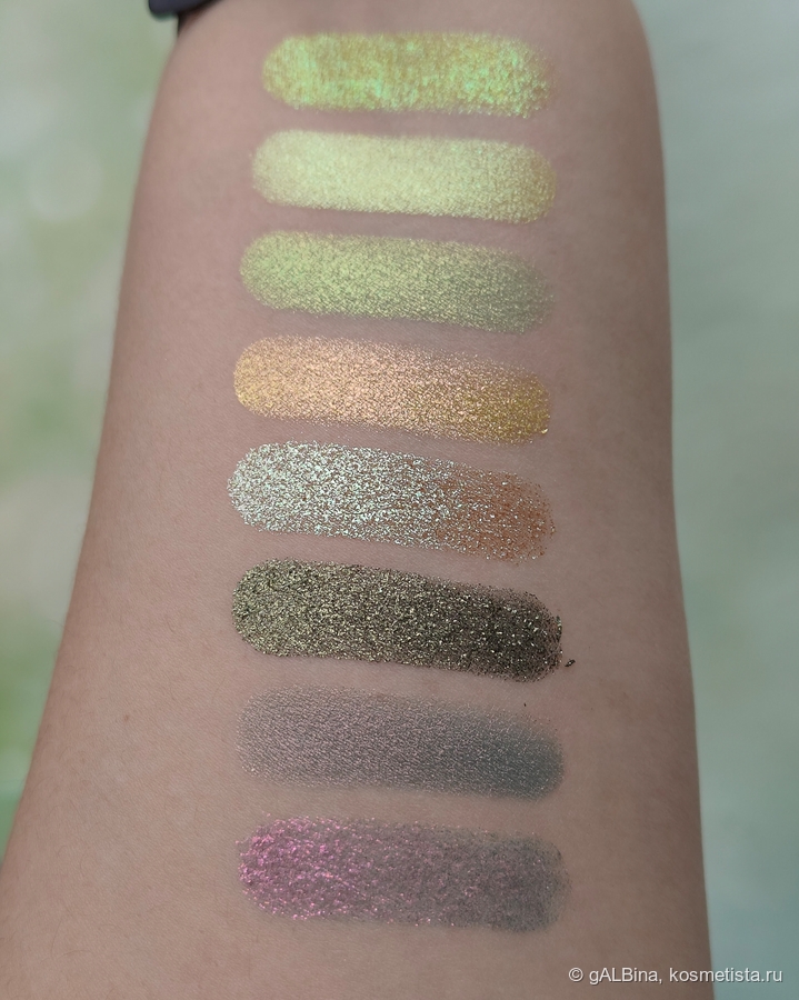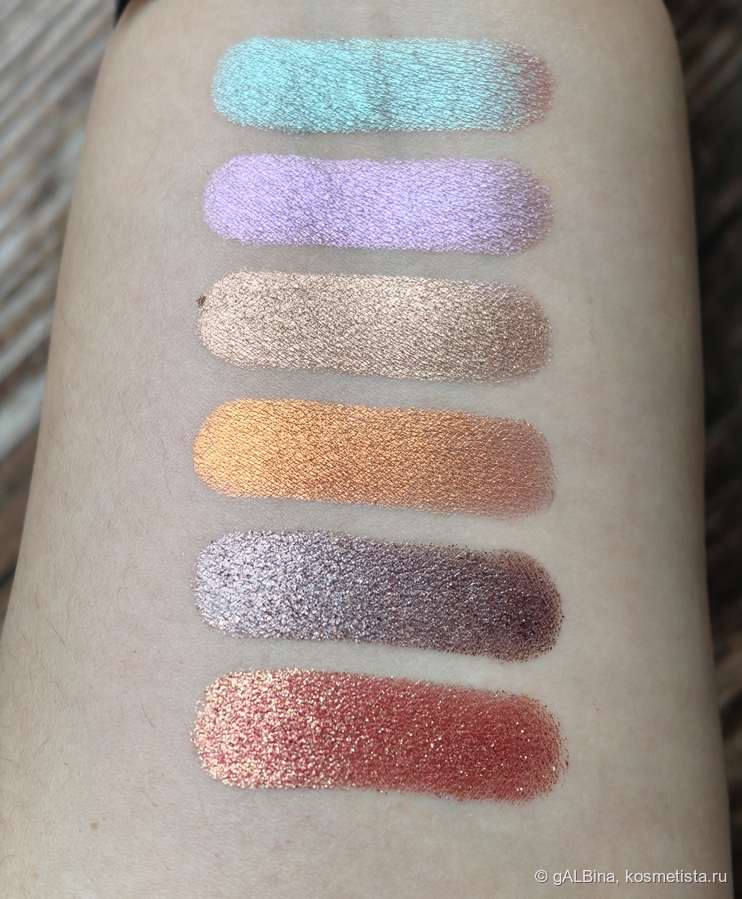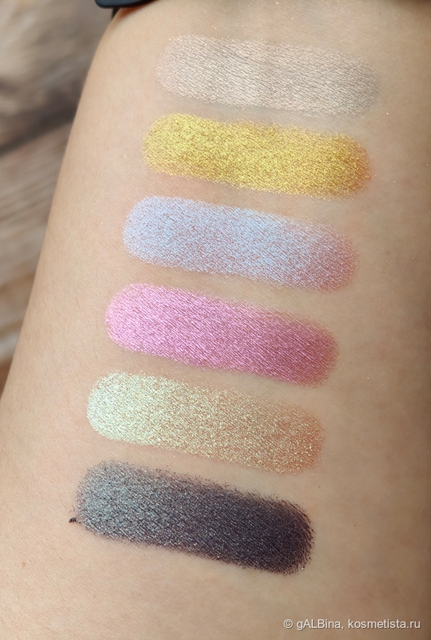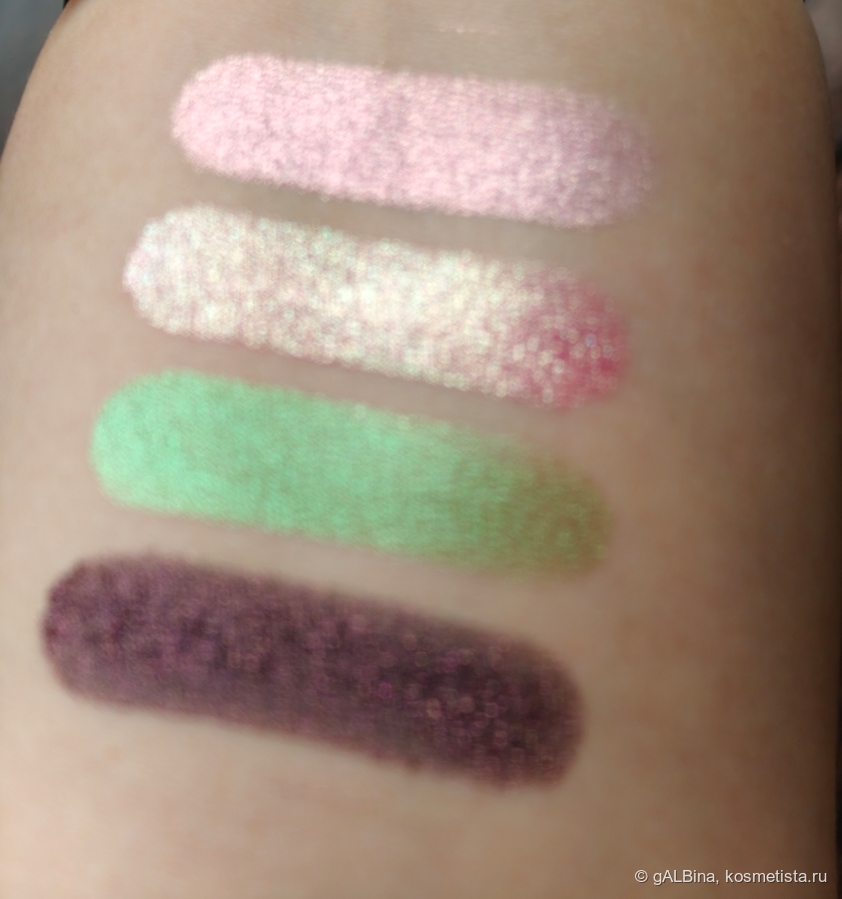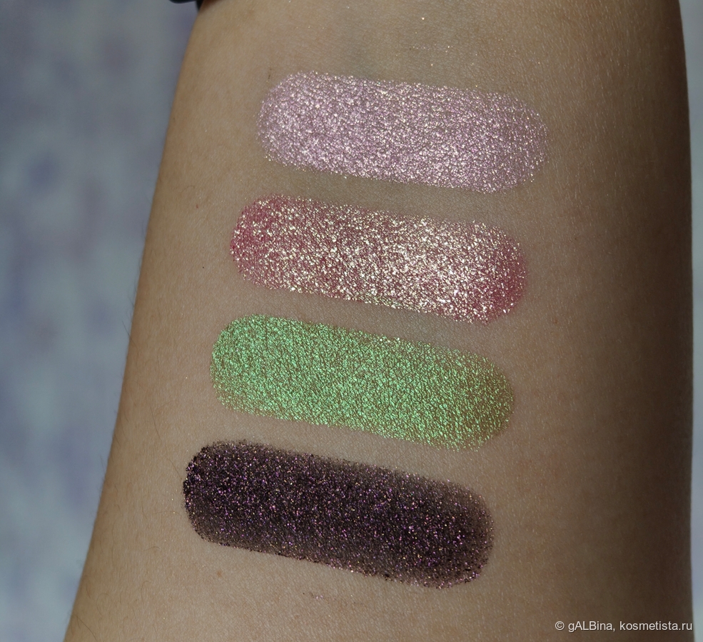 Даже при прессовке чувствуется, что оттенки разные как и в палетках, разные по текстуре. «Фифа» получается хлопушковой и жирненькой, «Неразлучная подруга» довольно сухой и рассыпчатой, «Эликсир вечности» у меня немного потемнел и как будто потерял в яркости, а вот все остальные хорошие и приятные сатины.