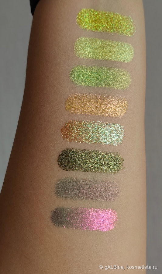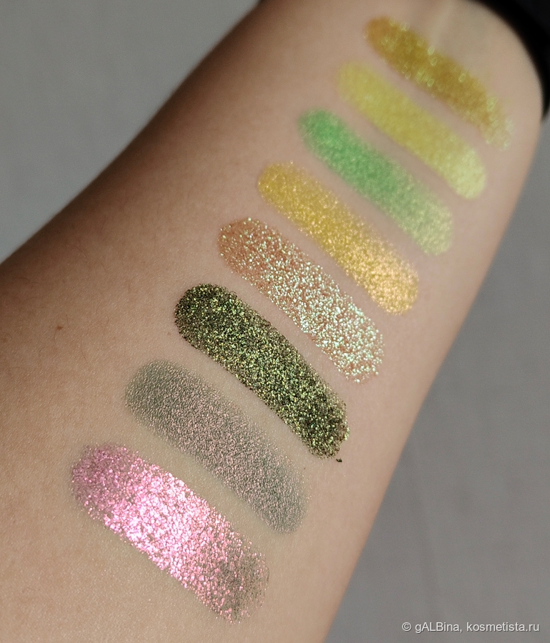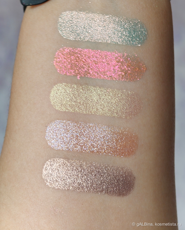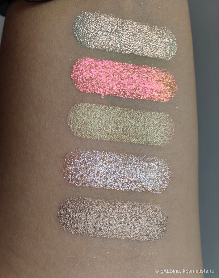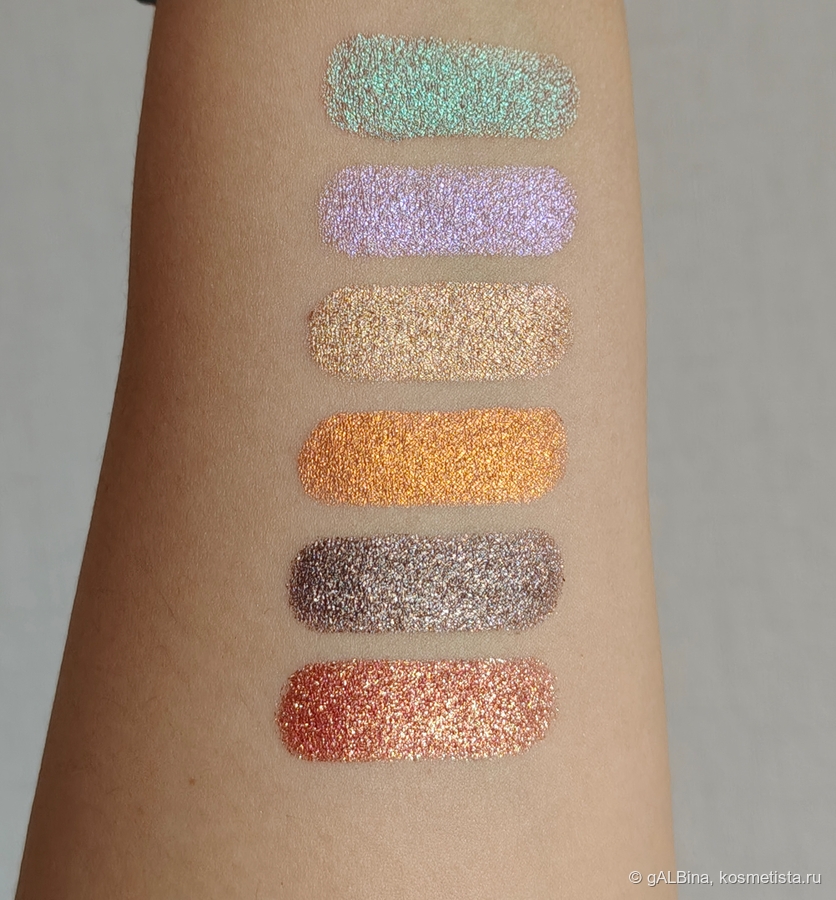 Даже при прессовке чувствуется, что оттенки разные как и в палетках, разные по текстуре. «Фифа» получается хлопушковой и жирненькой, «Неразлучная подруга» довольно сухой и рассыпчатой, «Эликсир вечности» у меня немного потемнел и как будто потерял в яркости, а вот все остальные хорошие и приятные сатины.