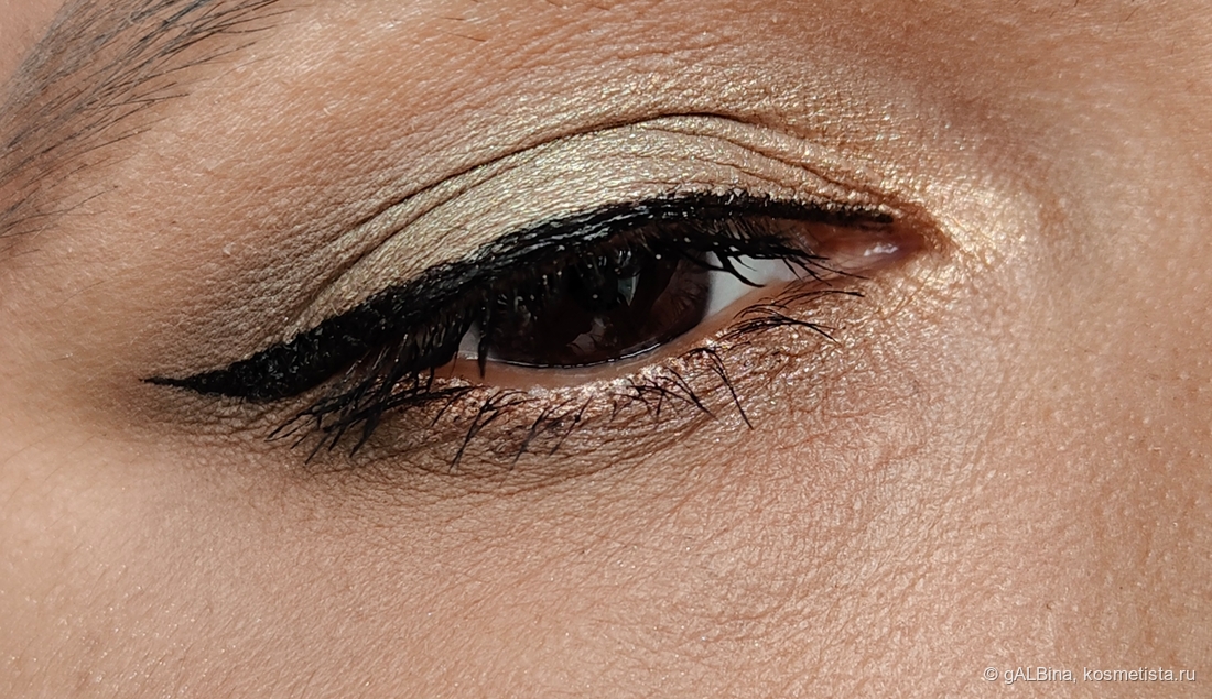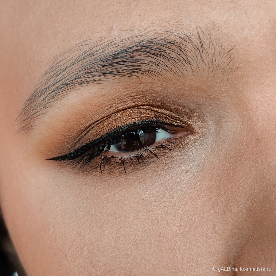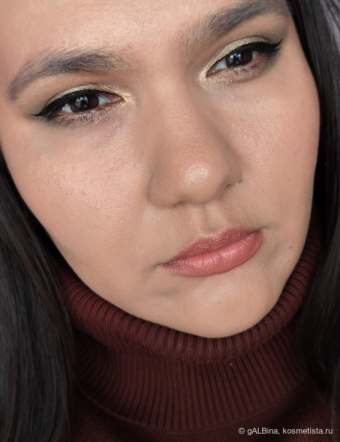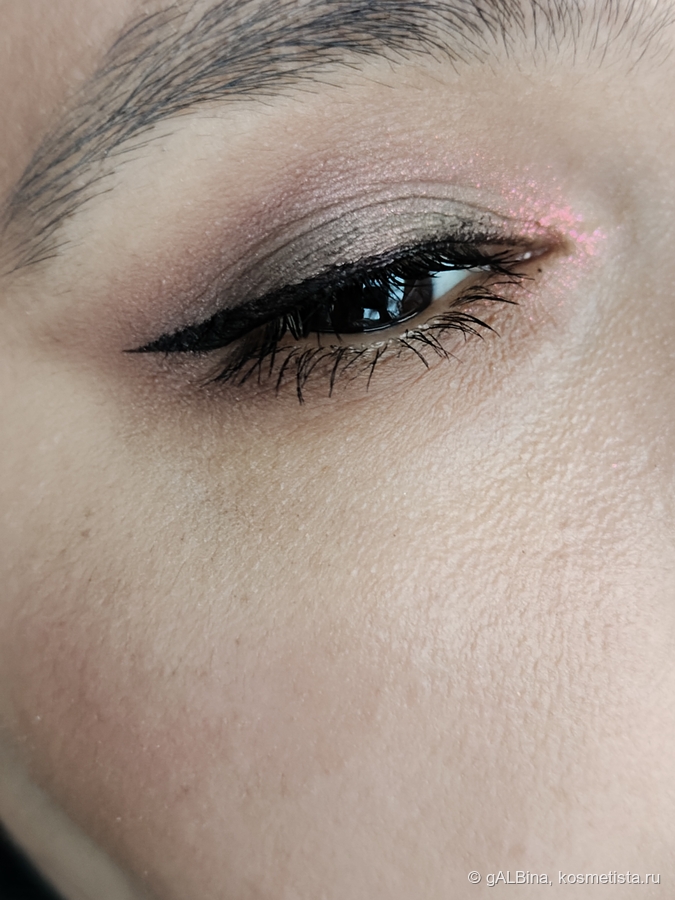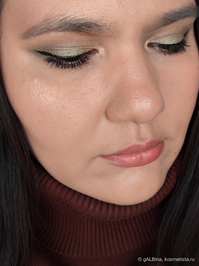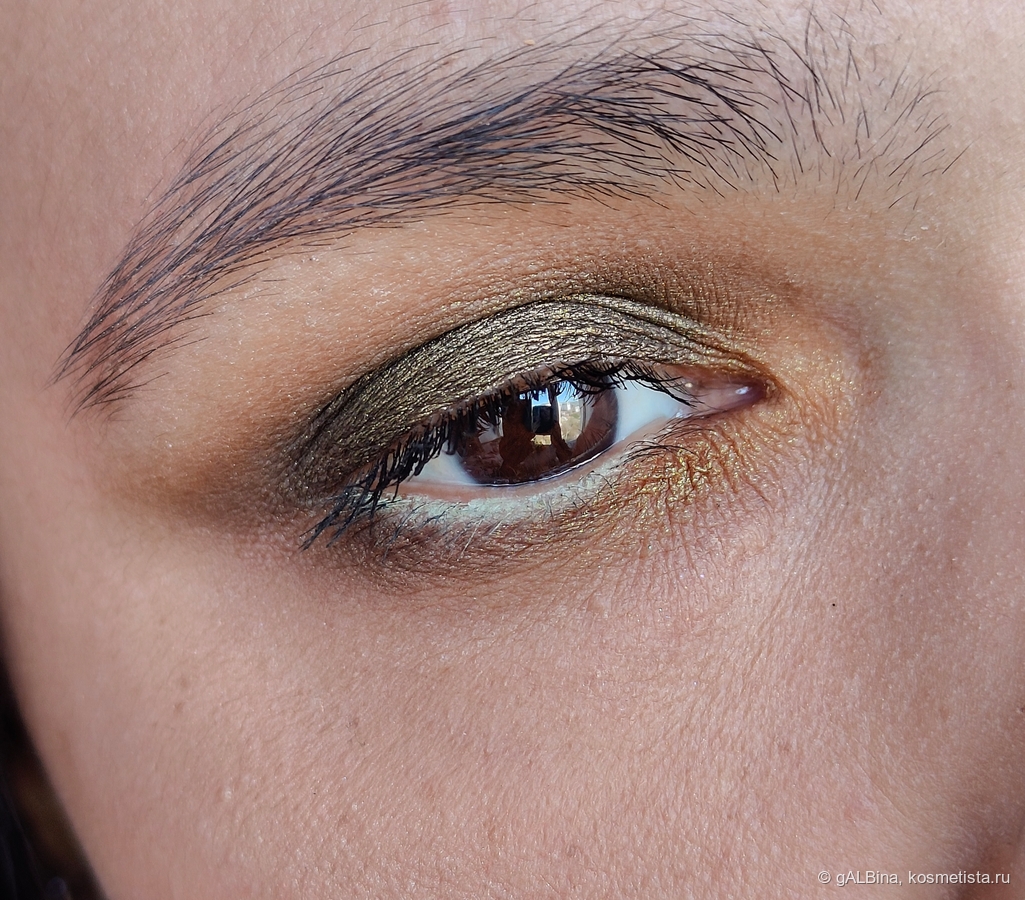 Матовые в палетке оказались прекрасные, но довольно сильно пылят. Но у меня вопрос к сияющим оттенкам. Мне нравилась старая «мучнистая» формула таких оттенков. Но именно в этой палетке набрать на кисть было сложно без «ковыряний». Возможно мои кисти слишком мягкие. Пальцем набирается конечно отлично. Первый макияж: светлый матовый в складке, всё подвижное веко 074, внутренний уголок 073, стрелка сделана тёмным матовым оттенком: