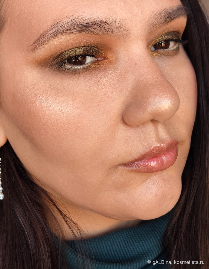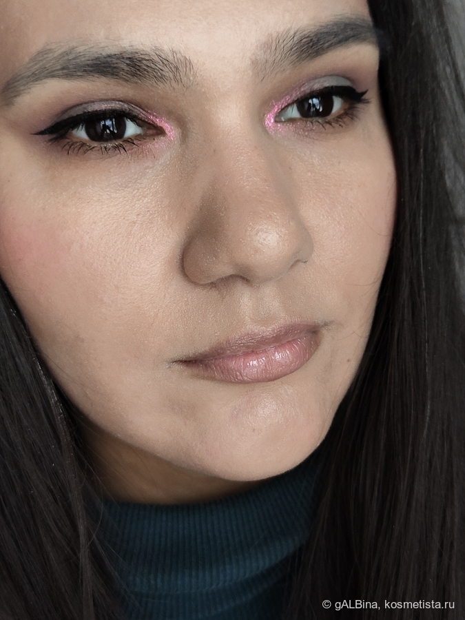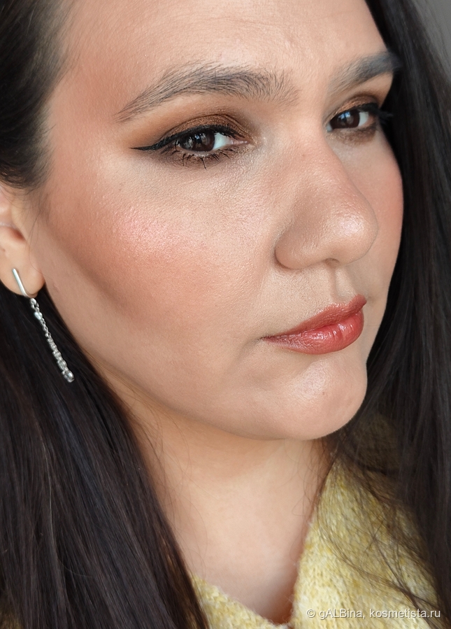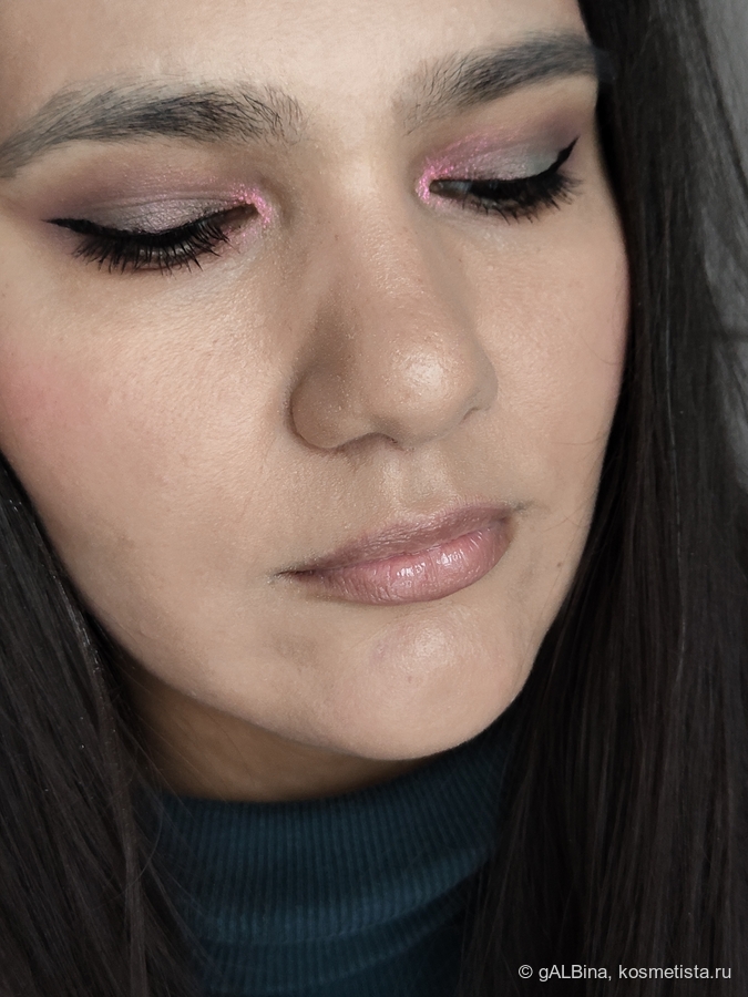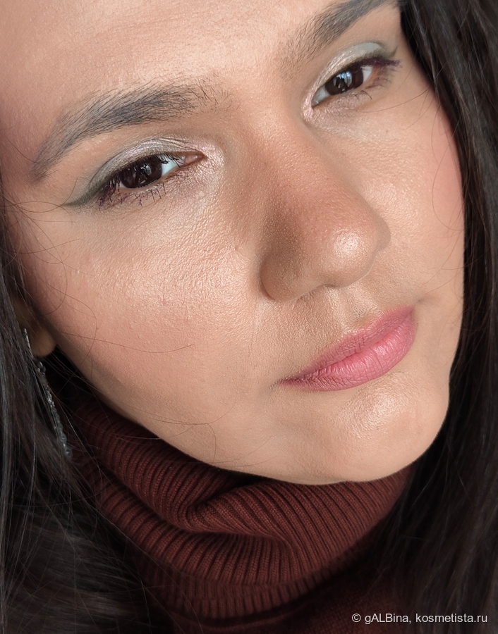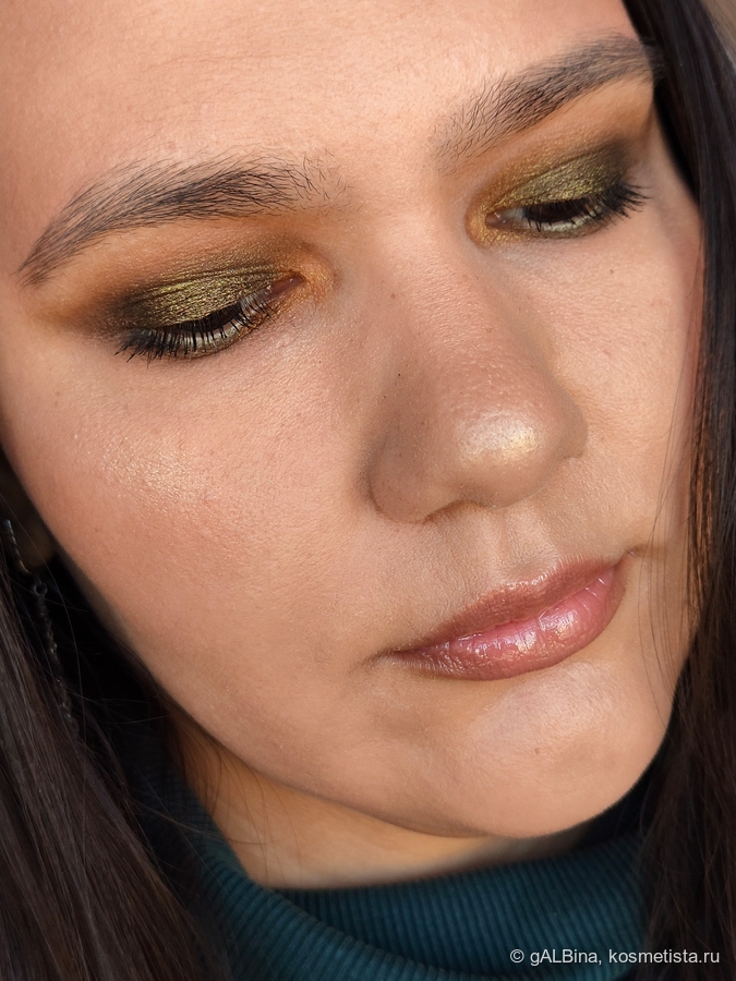 Матовые в палетке оказались прекрасные, но довольно сильно пылят. Но у меня вопрос к сияющим оттенкам. Мне нравилась старая «мучнистая» формула таких оттенков. Но именно в этой палетке набрать на кисть было сложно без «ковыряний». Возможно мои кисти слишком мягкие. Пальцем набирается конечно отлично. Первый макияж: светлый матовый в складке, всё подвижное веко 074, внутренний уголок 073, стрелка сделана тёмным матовым оттенком: