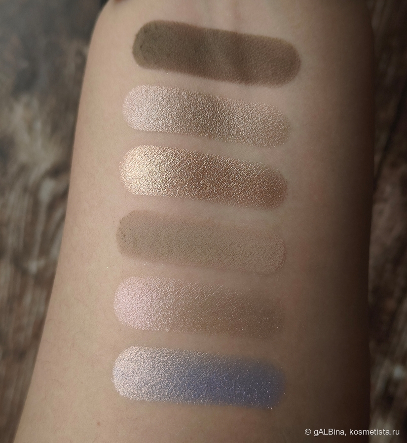 В целом палитра оказалась довольно лёгкой в работе, но стоит учитывать, что даже для смуглой кожи оттенки имеют довольно тёмную базу и один сложный оттенок со слюдой, который лучше сажать на липкую базу. Опять же, гамма на любителя, как раз для меня. Но стойкость отменная, ничего не скаталось и не забилось в складку века. Лёгкая тушёвка буквально в пару движений.