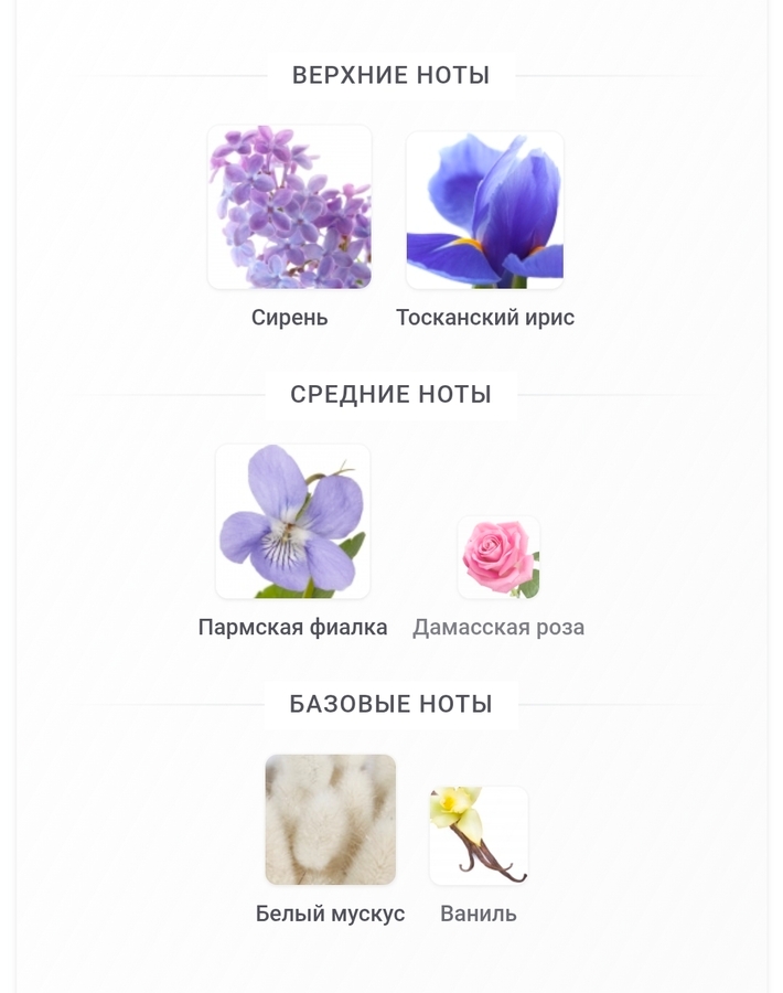 Аромат, где соединились все ноты весны: сиреневые цветы (сирень, ирис, фиалка), роза и всё это на базе из мускуса и ванили. И вроде это весна во флаконе, но и зимой раскрытие него великолепное.