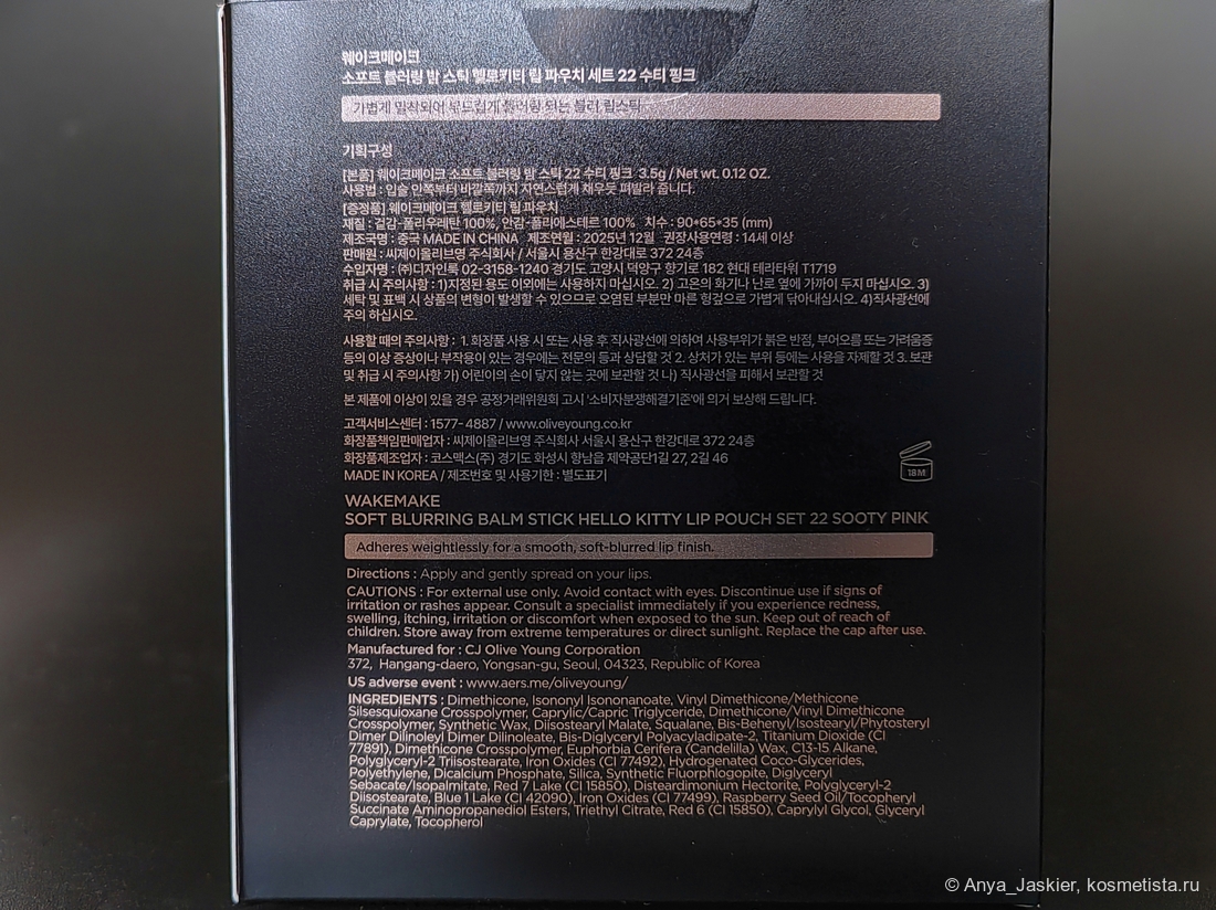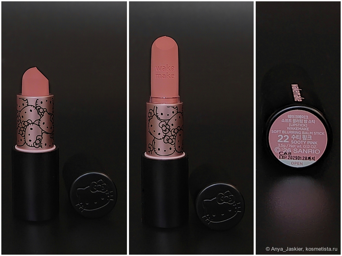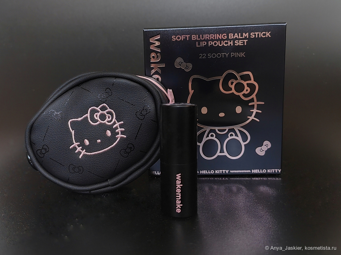Коллекция Wakemake x Hello Kitty вышла в продажу в марте этого года и сразу произвела впечатление своим необычным для ярких персонажей Sanrio выбором упаковок. Почти все продукты серии имеют черное оформление, даже брелок с самой Китти выполнен в черном цвете. Жаль, конечно, что они не залили черную помаду внутрь… Ну да ладно. В моем наборе кроме помады-бальзама присутствует косметичка (да-да, тоже черная!) Сама помада залита в металлический футляр на магнитной крышке, и он довольно увесистый для своих размеров. На тубе присутствует розовая надпись с названием бренда, выдавленное на крышке изображение Китти и наклейка на донышке. Минимализм во всей красе. Но когда снимаешь колпачок, под ним обнаруживается россыпь Китти на пыльно-розовом фоне. Крышка изнутри тоже розовая, кстати. Объем продукта 3.5 г, срок использования 18 месяцев, произведен в Корее.