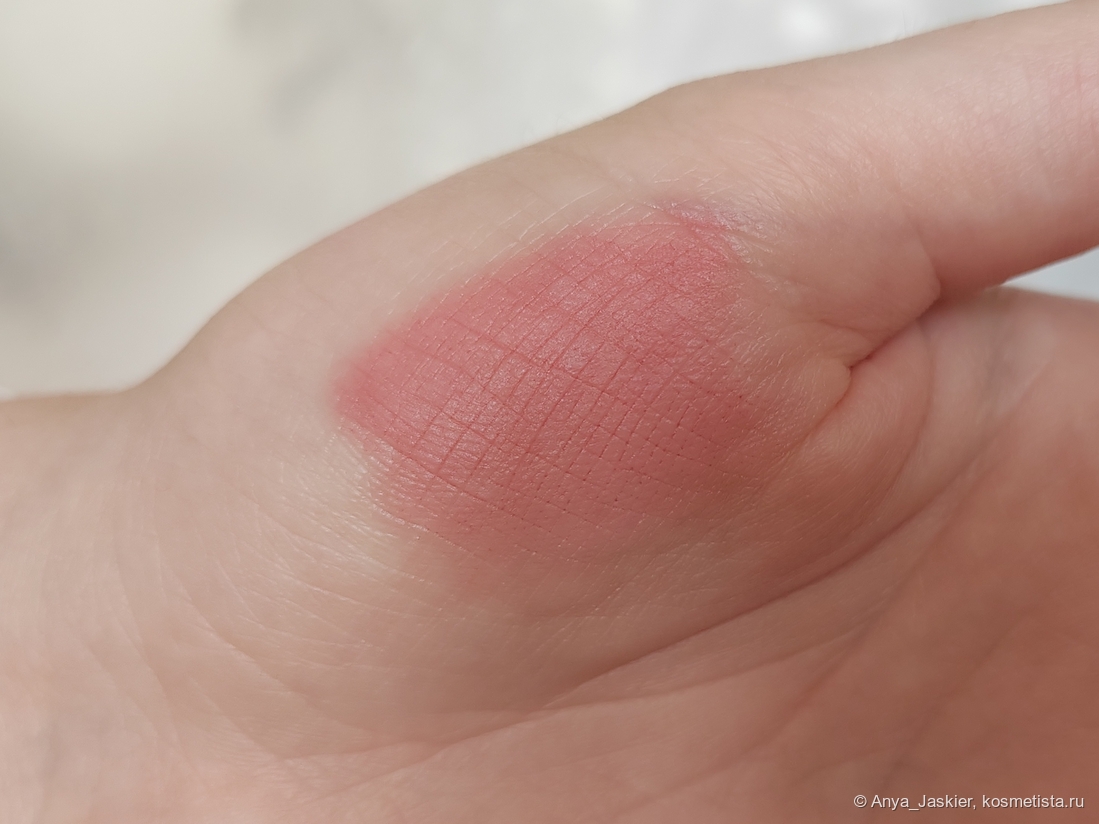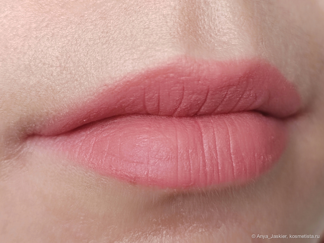 У стика был очень интересный срез, словно круглая вмятинка (она была идеально круглой, а артефакт сверху появился, когда я уронила помаду >_<). Им очень удобно не только прокрашивать ровный контур, но и создать размытый эффект. Цвет прохладный приглушенный розовый, меняющийся от нежного разбелённо-барбишного оттенка до почти кирпичного. Официальные свотчи максимально приближены к реальному цвету помады, вот только на себе я такой оттенок увидеть не смогла. По текстуре это очень приятный воздушный и нежный замес, абсолютно не ощущаемый на губах. Финиш вельветовый, бархатный. Аромата и вкуса нет. Помада абсолютно не сушит губы, даже немного увлажняет (поэтому в названии есть balm), при этом обладает отличной стойкостью (6-8 часов с легким перекусом) и не смазывается от случайного прикосновения. Полноценный обед она не переживет, но стакан воды и шоколадку — с легкостью. Стирается салфеткой, тинт не оставляет. Ее можно носить тонким слоем, а можно наслоить для большей насыщенности. Я предпочитаю второй вариант, для которого приходится довольно много слоев наносить, так что расход ощутимый (ура, она имеет шанс закончиться!) Помада не западает в рельеф, но не сглаживает шелушинки — это видно только на макро, однако текстура цепляется за сухие участки губ. Хотя в общем образе создается впечатление блюр-эффекта, и никаких недостатков на губах не видно. По ощущениям, Balm Stick кажется мне очень схожим с пудингами от fwee: такая же легкая текстура при матовом финише плюс явный цвет на выходе.