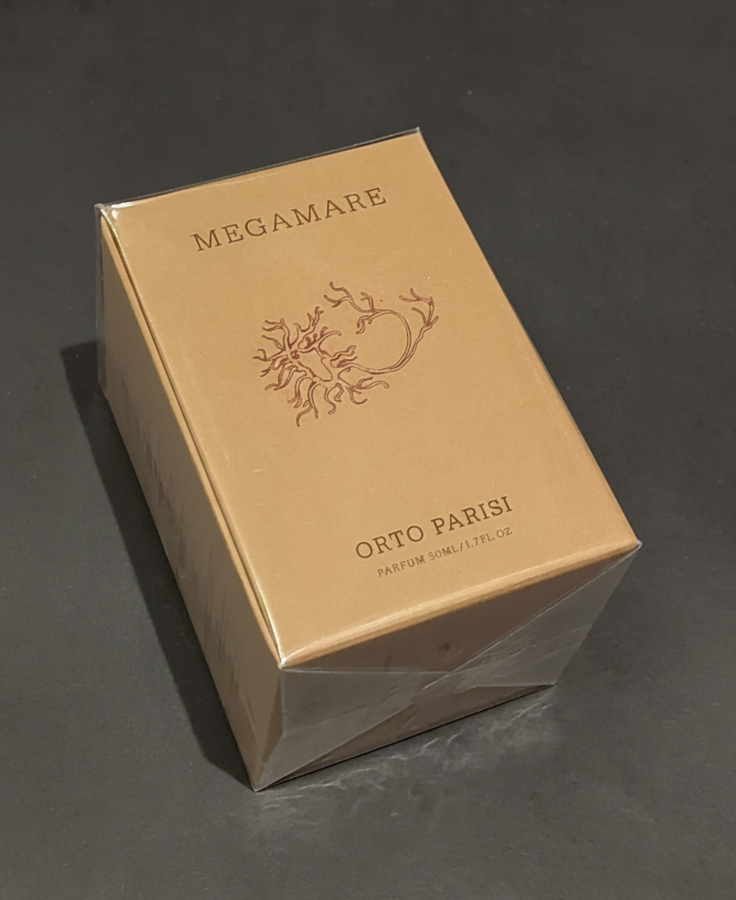 Коробка выполнена в коричневом оттенке, напоминающем плотный крафтовый картон, не самого обычного формата. На лицевой стороне крупно напечатано название Megamare, ниже — фирменный кораллово-красный символ, напоминающий морской коралл или абстрактную органическую форму, что снова отсылает к морской тематике аромата.