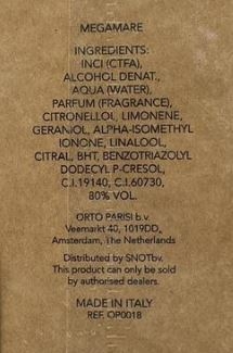 Флакон у Orto Parisi Megamare выглядит просто, но эстетично, сразу производит впечатление парфюма с характером. Он выполнен из толстого прозрачного стекла с массивным тяжелым дном. Форма строгая, лаконичная, прямоугольная, со скругленными углами, без лишнего декора, но именно в этой простоте и чувствуется стиль. Отдельного внимания заслуживает крышка — крупная, цилиндрическая, массивная, с грубой фактурой состаренного металла с элементами зеленной коррозии, а сверху инкрустация — морская раковина из Гаити. Выглядит немного брутально, словно какая-то металлическая деталь, найденная на побережье, возможно, и от корабля. Этикетка минималистичная: узкая полоска с надписью Orto Parisi, выполненной строгим шрифтом. Всё очень сдержанно, без вычурности и показной роскоши.