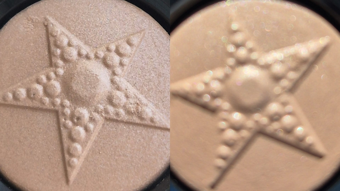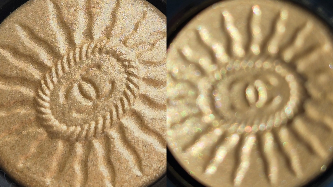 Самый рыхлый, рассыпается на отдельные золотые сияющие частицы по коже при нанесении. Но хотя бы не осыпается при этом. Независимо от выбранного способа нанесения эффект всегда один — россыпь золотых частиц. Как применение — внутренний угол глаза.