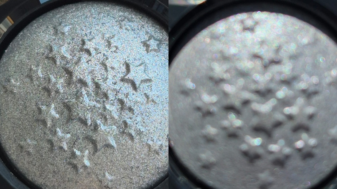 Каждый из оттенков покажу при комнатном освещении без прямого солнца (слева) и на солнце в расфокусе, чтобы оценить степень сияния и наличие сияющих частиц.