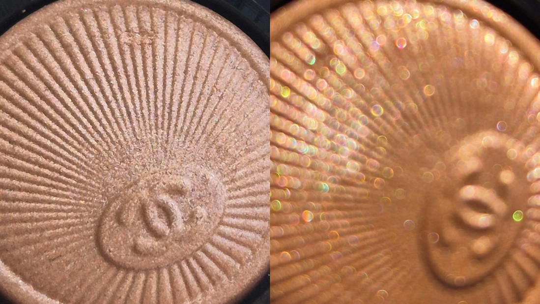 В тени он чуть прохладнее, но на солнце виден блеск и истинный бронзовый оттенок. Мягкий, рыхловатый в рефиле, тем не менее, при переносе на кожу не пылит. Кисть его любит, никаких усилий не требуется.