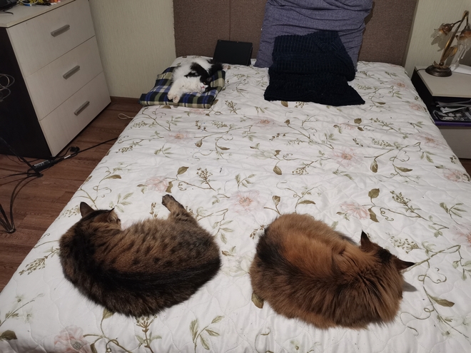Старшая кош, надеюсь, не сильно страдает. А то бывает непросто с новичками. Наша мадам так котов и не приняла, живут по разным помещениям(