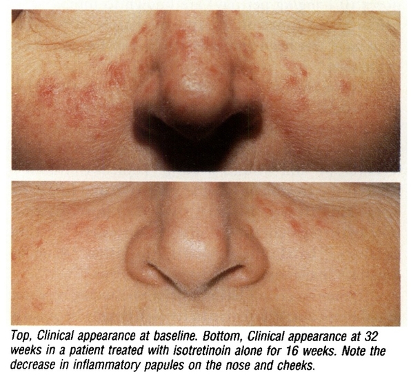 В обзорной научно-медицинской литературе рассматриваются разные схемы лечения, так там вообще кто во что горазд, в ход идет все (причем, иногда еще и в комбинации): противопаразитарные, антибиотики и синтетические антибактериальные (как внутрь, так и наружно), иммуносупрессоры (как внутрь, так и наружно), азелаинка, ретиноиды (как внутрь, так и наружно), фототерапия… Сразу видно, что четкого понимания нет, что делается (типа, а давайте просто попробуем все лекарства подряд, авось что прокатит).