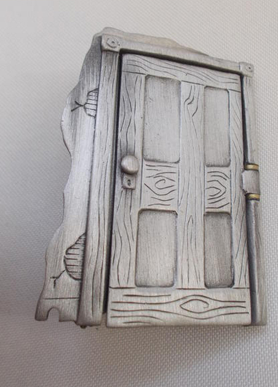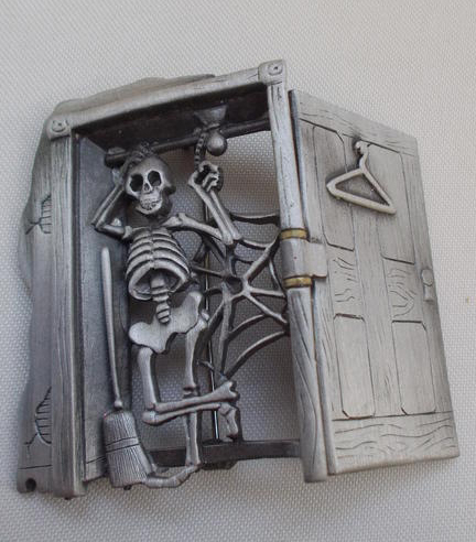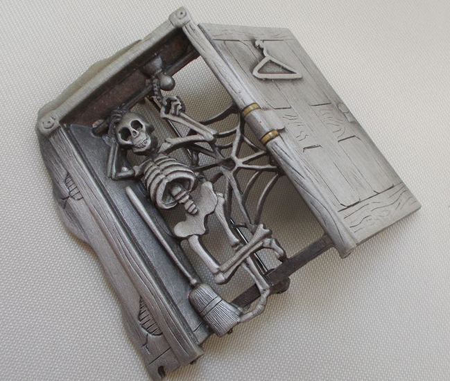 Вениамин или попросту Веня, очаровательный скелетик в шкафчике, выполненный в виде броши. Дверка шкафчика также сделана весьма занятно, причем прямо в процессе носки ее можно закрыть, приоткрыть или распахнуть настеж, так устроен механизм дверки.