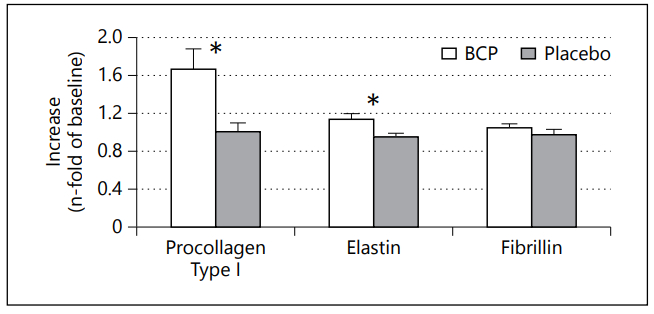 б) с последующим исследованием флюидов материалов биопсии с помощью иммуноферментного анализа — количество проколлагена I типа и эластина статистически значимо увеличилось через 8 недель приема коллагена, в отличие от плацебо: