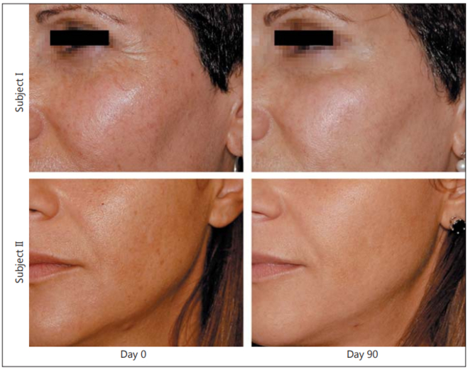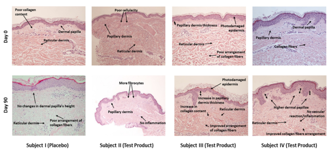 3) время, необходимое для проявления позитивных кожных эффектов в большинстве исследований, составило 90 дней, и результат сохранялся в течение 4 недель после окончания приёма добавок. Исследования с использованием добавок с более высокими концентрациями дипептидов Pro-Hyp и Hyp-Gly показали видимые улучшения оцениваемых параметров уже через 4 недели.