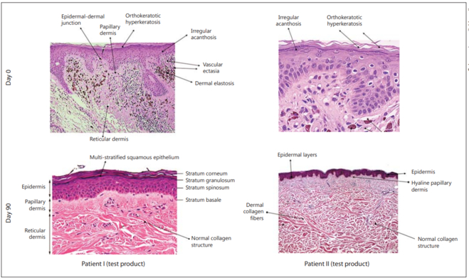 а) с последующим исследованием материала под микроскопом — на гистологии видно улучшение качества кожи — улучшение структуры дермы и стратификации эпидермальных слоев, улучшение структурной архитектуры коллагена в дерме (увеличение ширины волокон и параллельности расположения коллагеновых волокон):