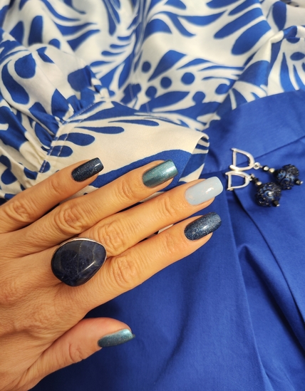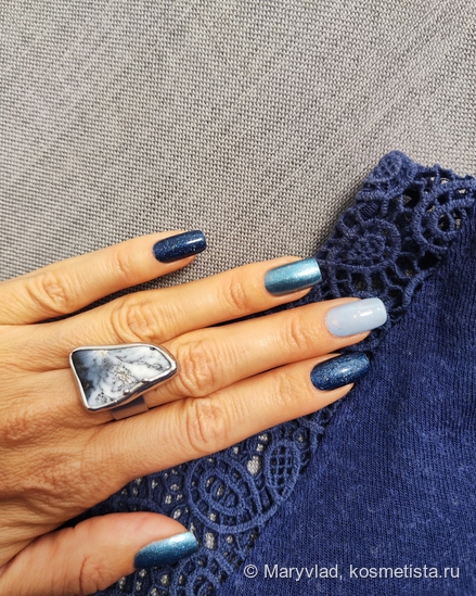 Сегодня синий брючный костюм, по стечению обстоятельств куртка тоже серо-голубая. Завтра будет платье в разводах, один в один с маникюром.