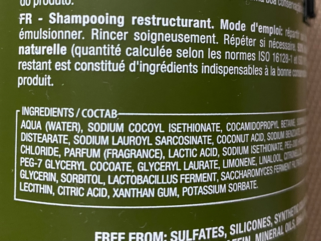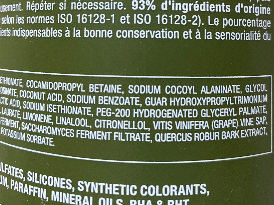AQUA (WATER), SODIUM COCOYL ISETHIONATE, COCAMIDOPROPYL BETAINE, SODIUM COCOYL ALANINATE, GLYCOL DISTEARATE, SODIUM LAUROYL SARCOSINATE, COCONUT ACID, SODIUM BENZOATE, GUAR HYDROXYPROPYLTRIMONIUM CHLORIDE, PARFUM (FRAGRANCE), LACTIC ACID, SODIUM ISETHIONATE, PEG-200 HYDROGENATED GLYCERYL PALMATE, PEG-7 GLYCERYL COCOATE, GLYCERYL LAURATE, LIMONENE, LINALOOL, CITRONELLOL, VITIS VINIFERA (GRAPE) VINE SAP, GLYCERIN, SORBITOL, LACTOBACILLUS FERMENT, SACCHAROMYCES FERMENT FILTRATE, QUERCUS ROBUR BARK EXTRACT, LECITHIN, CITRIC ACID, XANTHAN GUM, POTASSIUM SORBATE