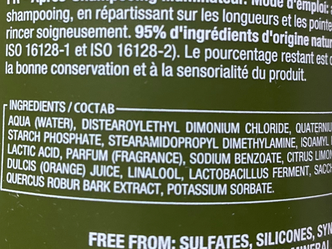AQUA (WATER), DISTEAROYLETHYL DIMONIUM CHLORIDE, QUATERNIUM-87, CETEARYL ALCOHOL, HYDROXYPROPYL STARCH PHOSPHATE, STEARAMIDOPROPYL DIMETHYLAMINE, ISOAMYL LAURATE, CETYL ESTERS, PROPYLENE GLYCOL, LACTIC ACID, PARFUM (FRAGRANCE), SODIUM BENZOATE, CITRUS LIMON (LEMON) FRUIT EXTRACT, CITRUS AURANTIUM DULCIS (ORANGE) JUICE, LINALOOL, LACTOBACILLUS FERMENT, SACCHAROMYCES FERMENT FILTRATE, CITRIC ACID, QUERCUS ROBUR BARK EXTRACT, POTASSIUM SORBATE