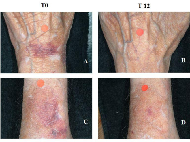 В качестве интересного примера можно привести статью по лечению дерматопорозов (старческой пурпуры Бейтмана) с помощью крема с 5% витамином С (a solution of 5% L-ascorbic acid (vitamin C) in glycerol at pH 6.0 emulsified in a silicone base — как мы видим, концентрация, pH и база отличаются от скинсьютикаловских). 3-месячное использование привело к клинически значимому уменьшению выраженности пурпуры, а также увеличению эластичности и толщины кожи (замерено инструментально):