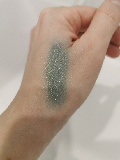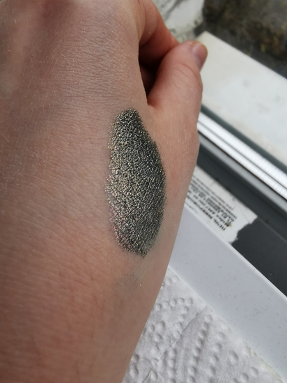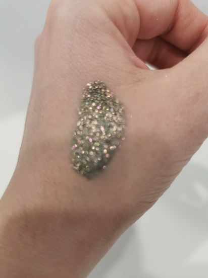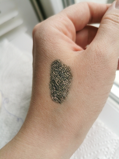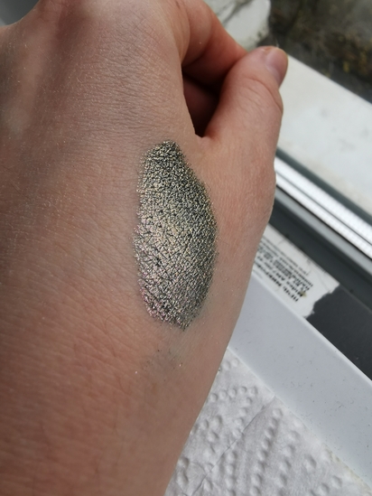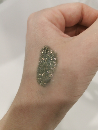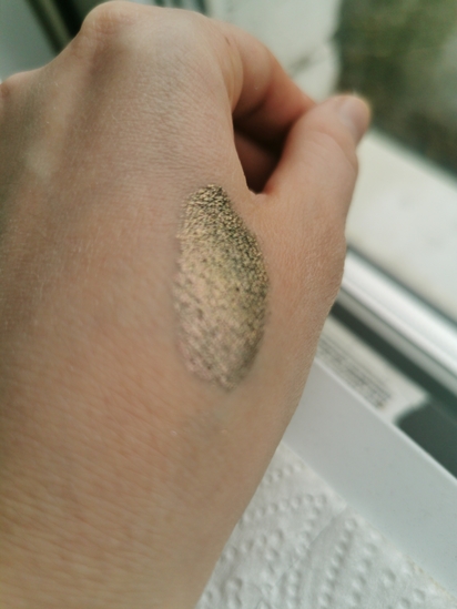 Нанесла плоской кистью на кремовую базу. Очень похож на «Хозяйку затонувшего корабля». В баночке, кстати, тоже, только блёстки немного отличаются.