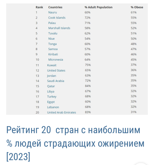 «По данным Lancet, Россия входит в восьмерку стран, где проживает больше половины всего населения планеты с лишним весом и ожирением. Кроме России, в список входят Китай, Индия, США, Бразилия, Мексика, Индонезия и Египет. В 2021 году в России распространенность ожирения и избыточного веса среди женщин составляла 67%, а среди мужчин — 62%. По прогнозу, к 2050 году общая цифра будет в районе 73%».