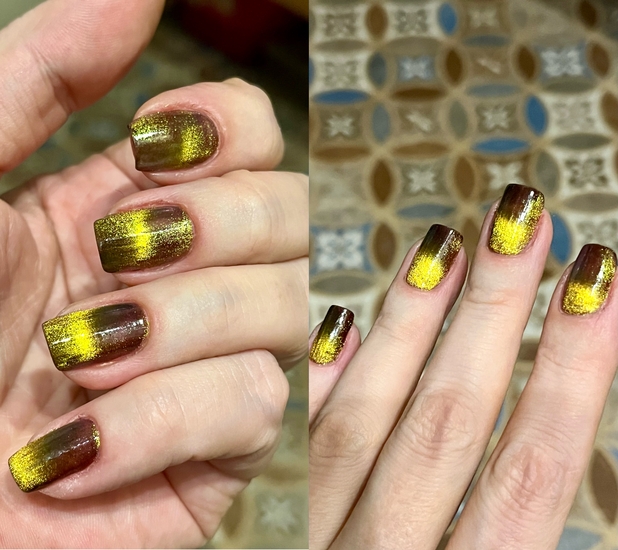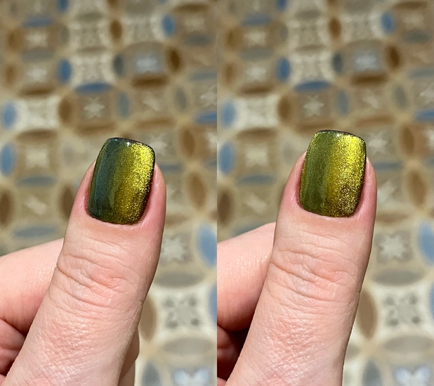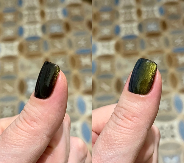 У меня практически та же ситуация с Cirque Colors Delusions of Grandeur. Там, правда, блик не заявлен прям зеленым, но база в коричневу, и получается серо-буро… ну вы поняли😜