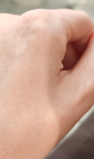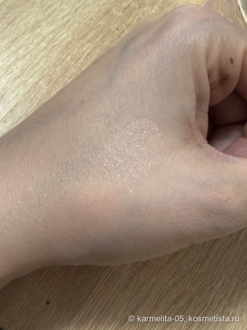 Вот только что достала, при ярком искусственном свете можно разглядеть блеск, но тут и свотч прям жирный, на лицо так и не наносят.