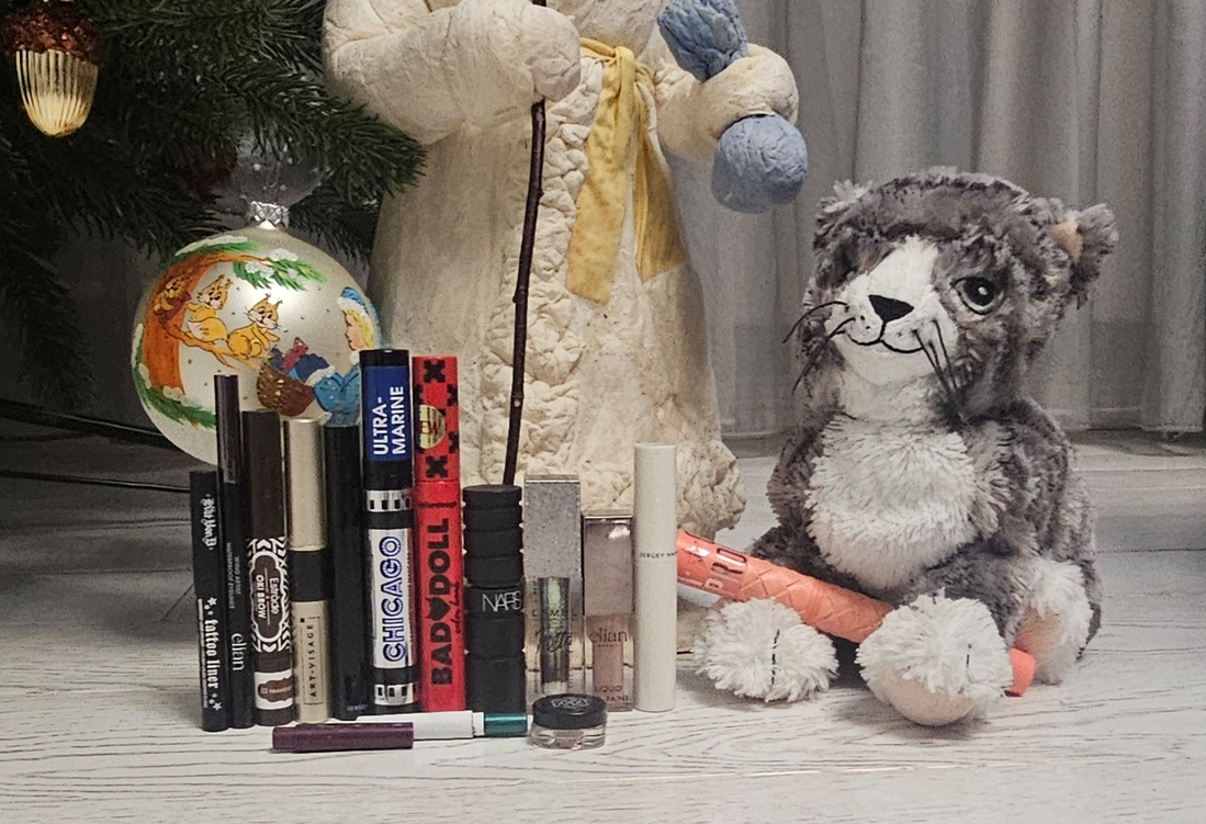 Пять тушей (чёрная, две коричневых разной насыщенности, синяя и красная), две подводки-фломастера, при том, что я почти не рисую стрелки, два флакона жидких теней, карандаши для межреснички и слизистой, пигмент Кристал минералс «Жемчужные пуанты», база под тени, гель для бровей (один, тк до сих пор использую 16 мл got2b) и помада для бровей из какого-то бокса (высохла).