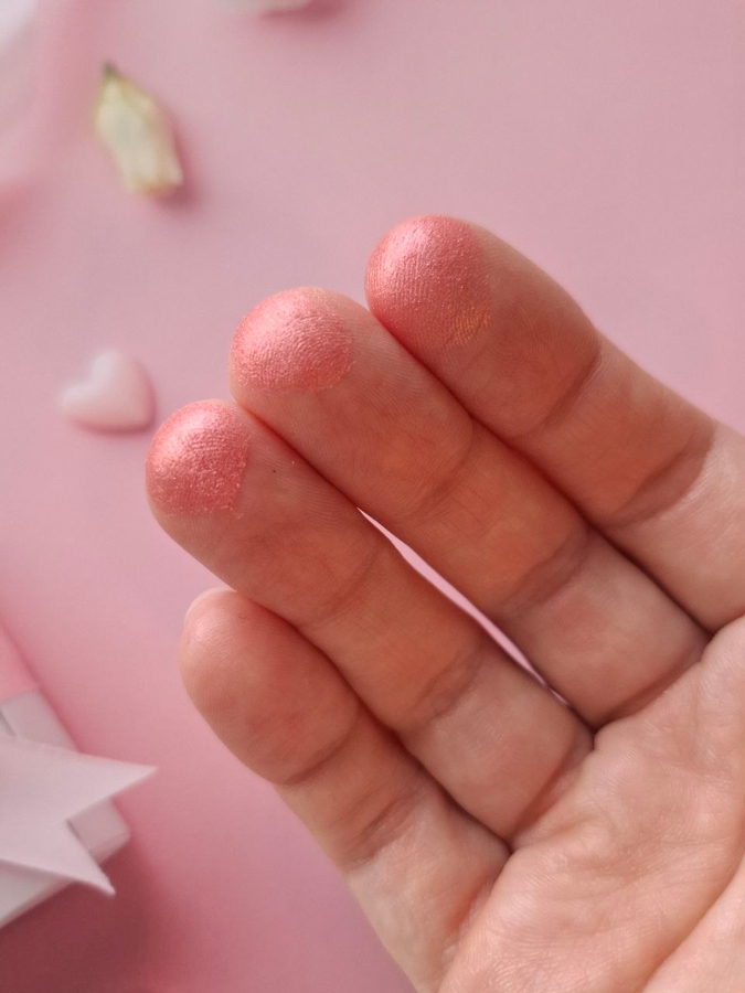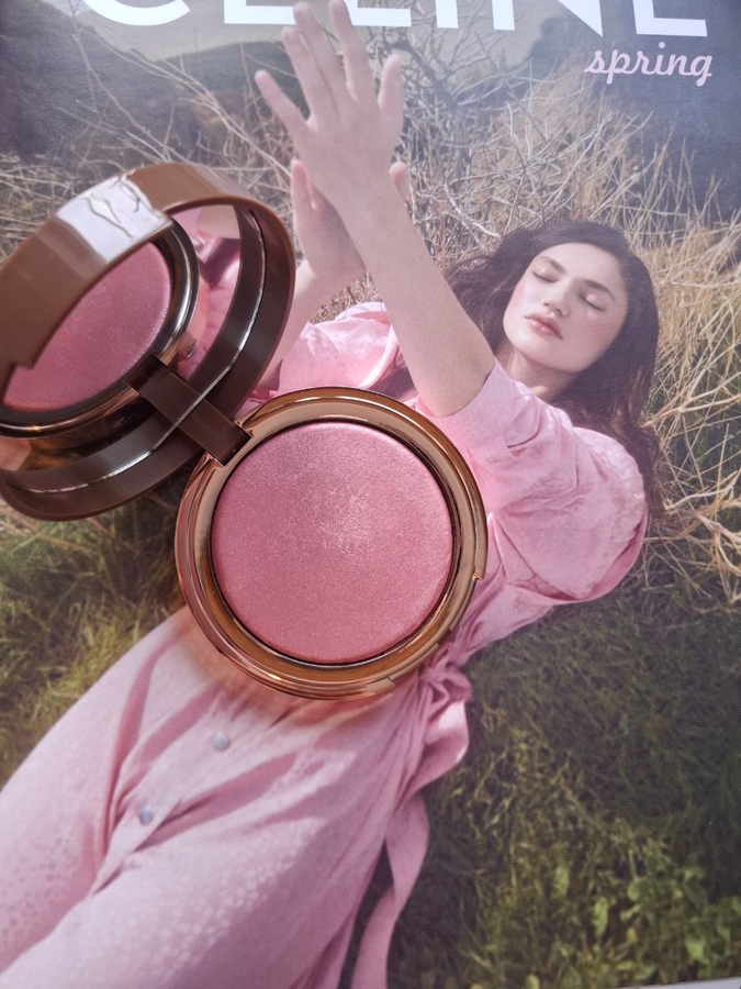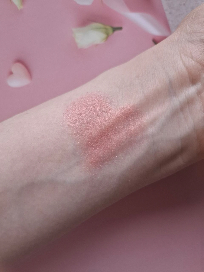 Цвет румян сложный, глубокий и дорогой розово-персиковый. Он самый универсальный цвет из всей линейки. Видны частички золота, хайлайтер при использовании румян не нужен.
